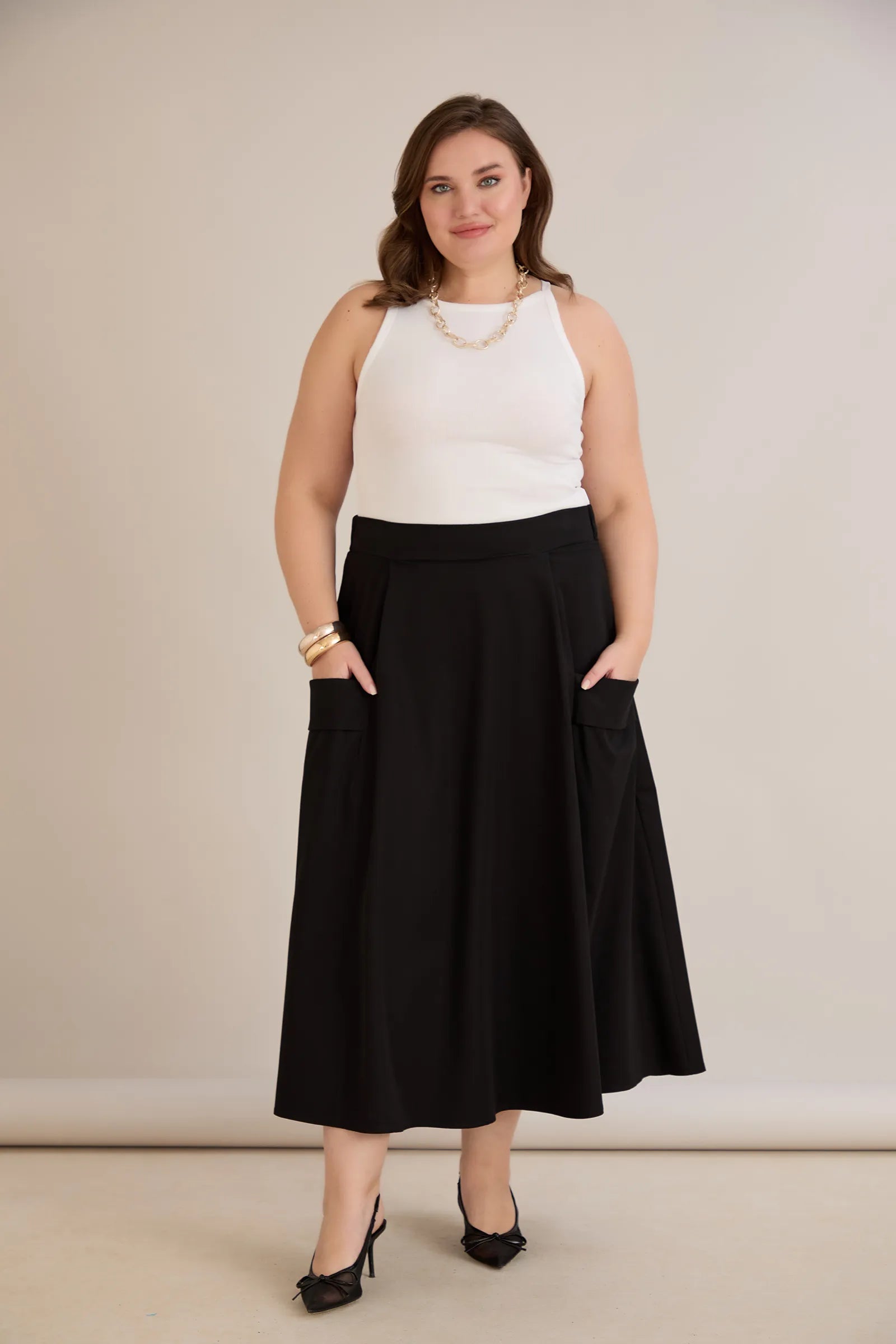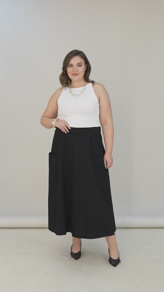 Спортно-елегантна пола миди дължина с джобове