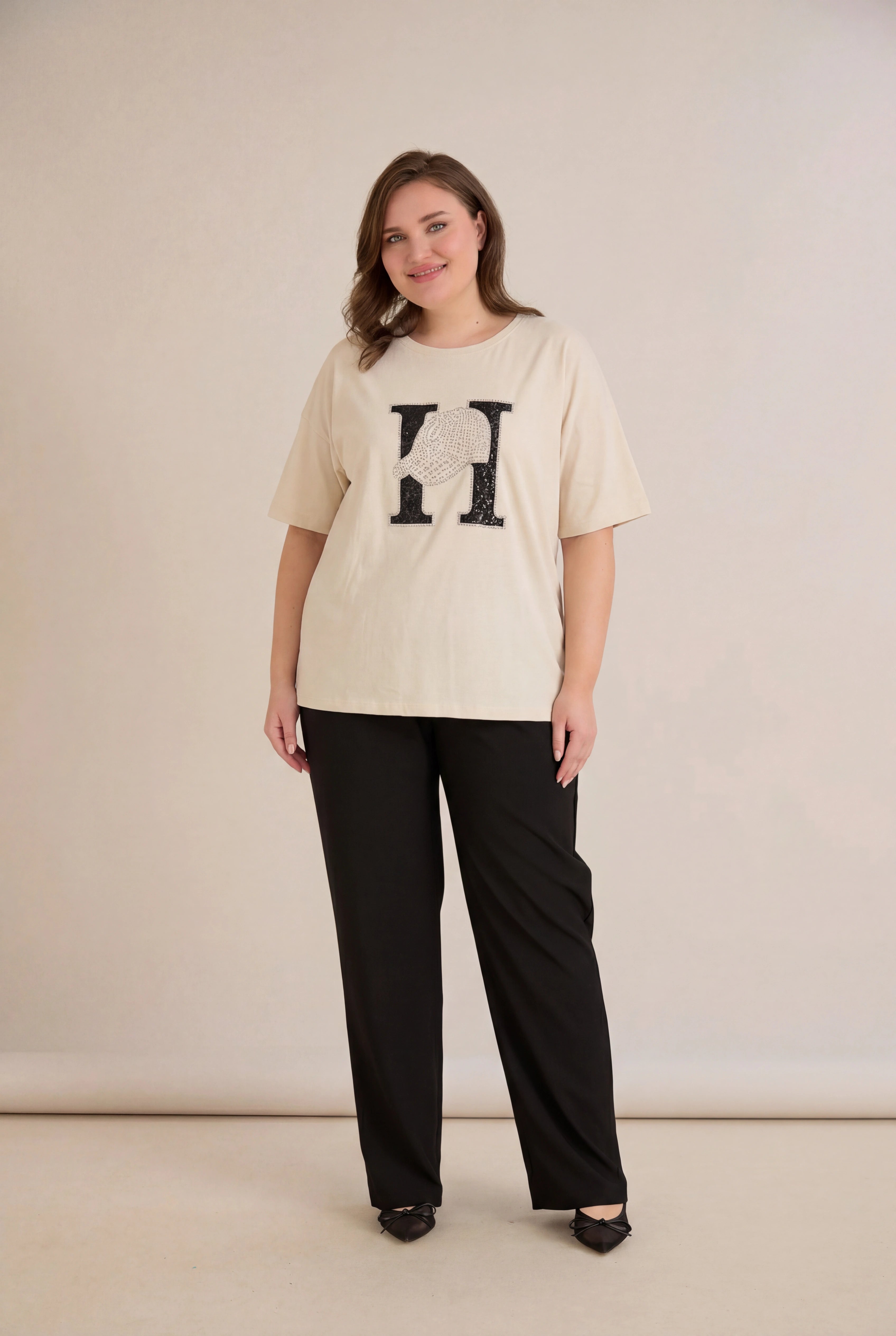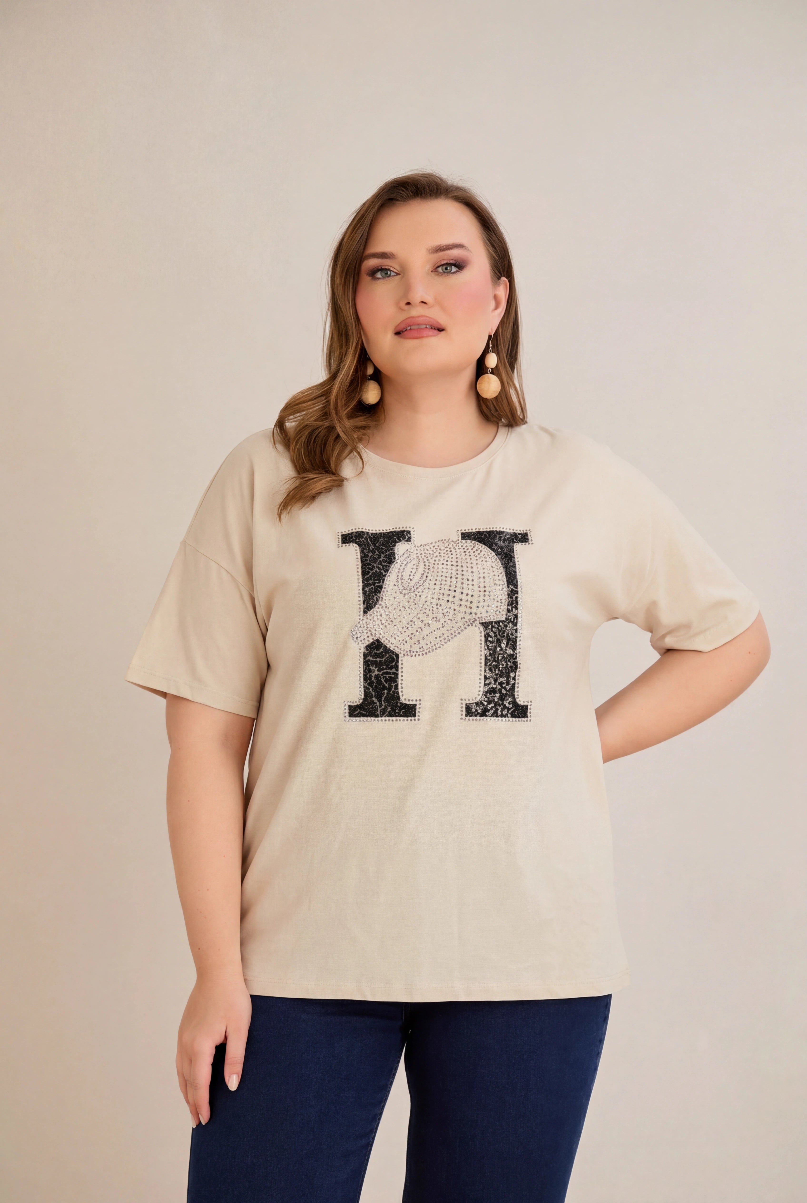 Памучна тениска с ефектна щампа с камъчета