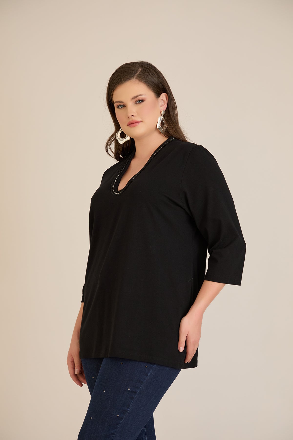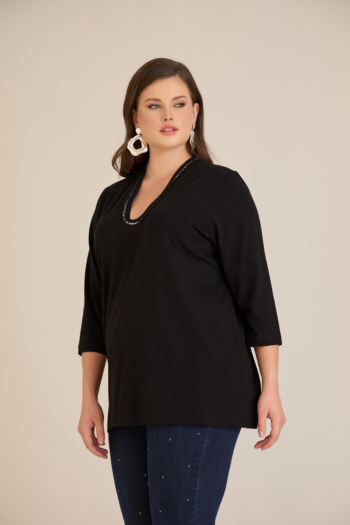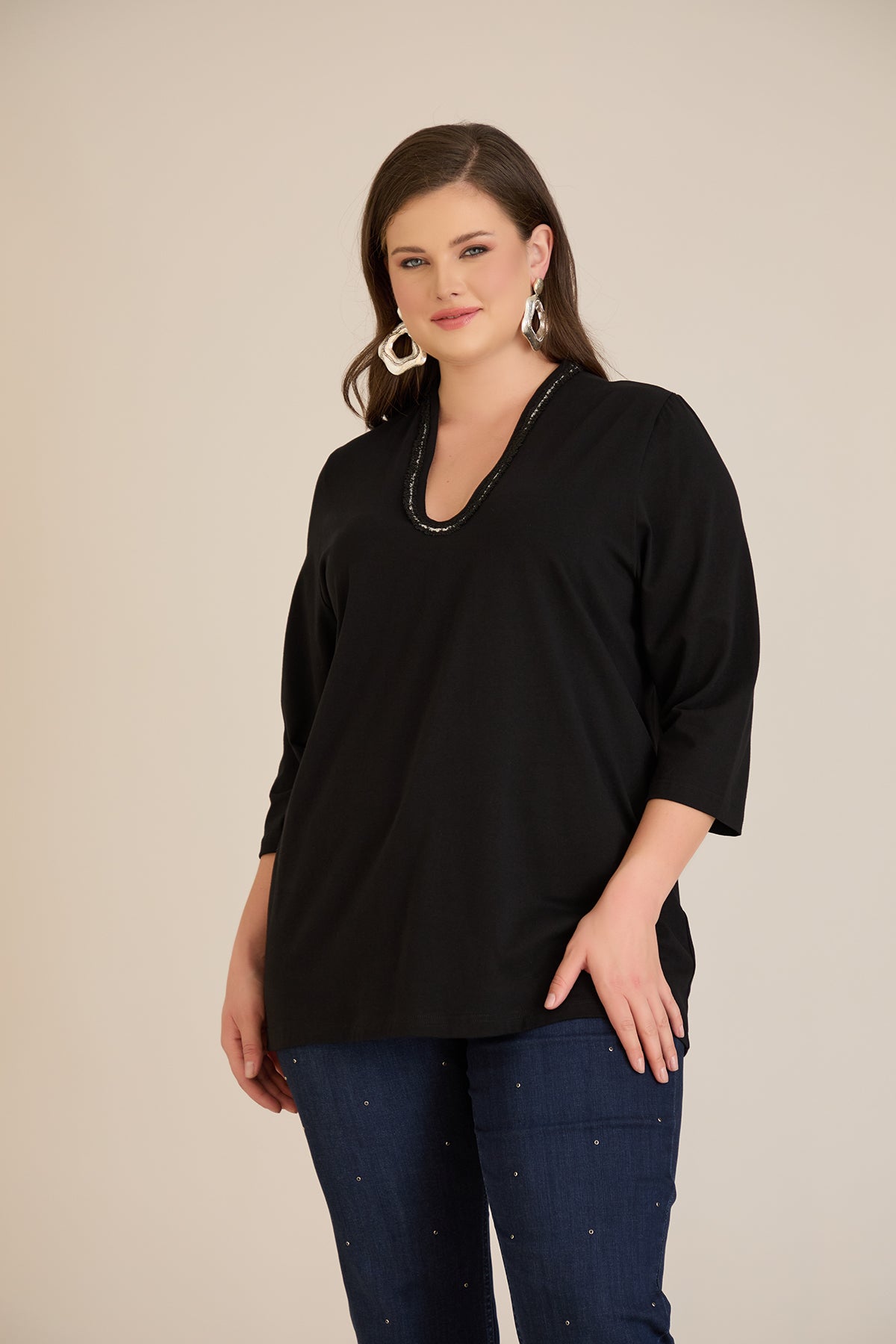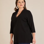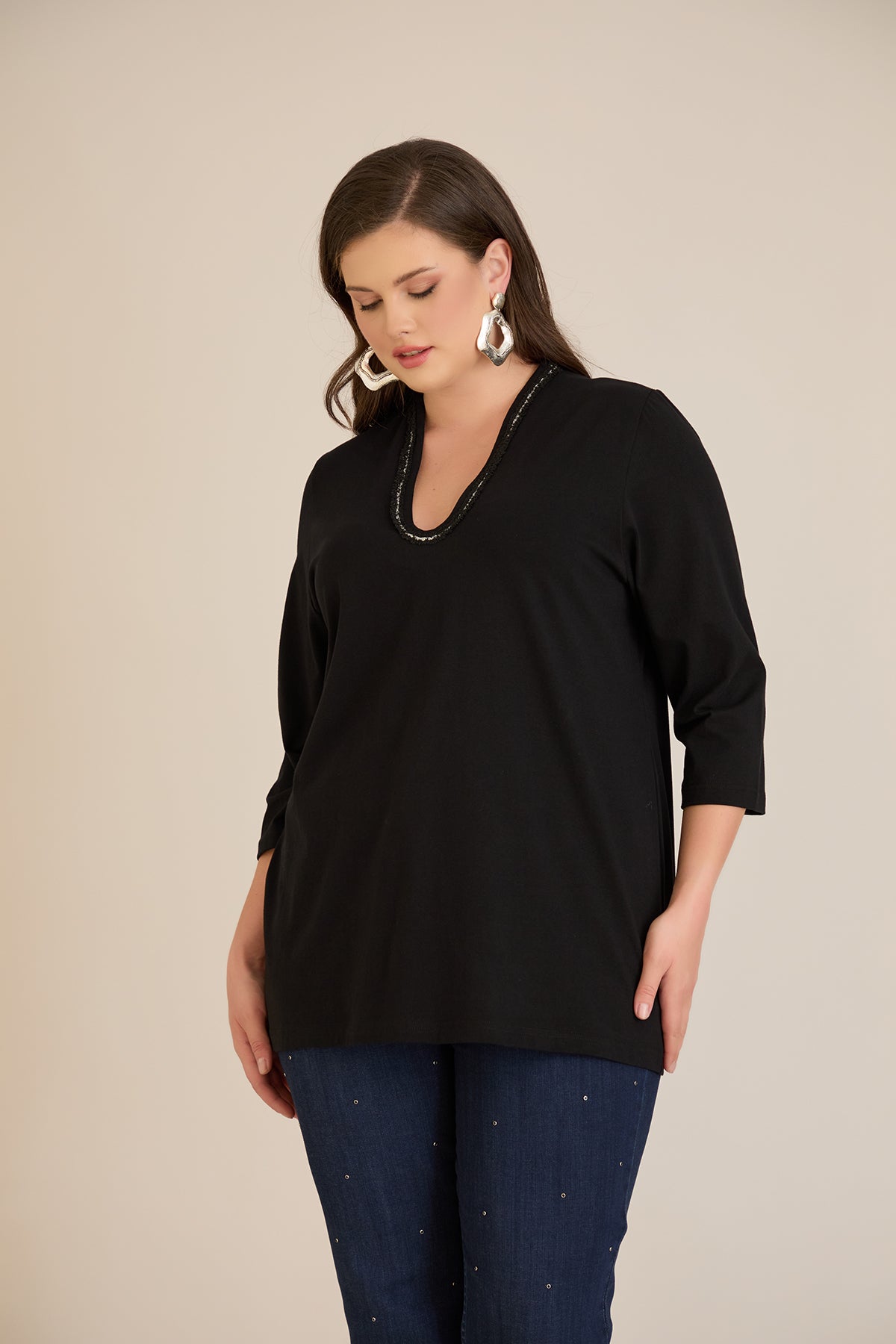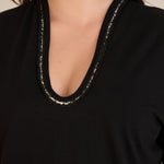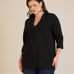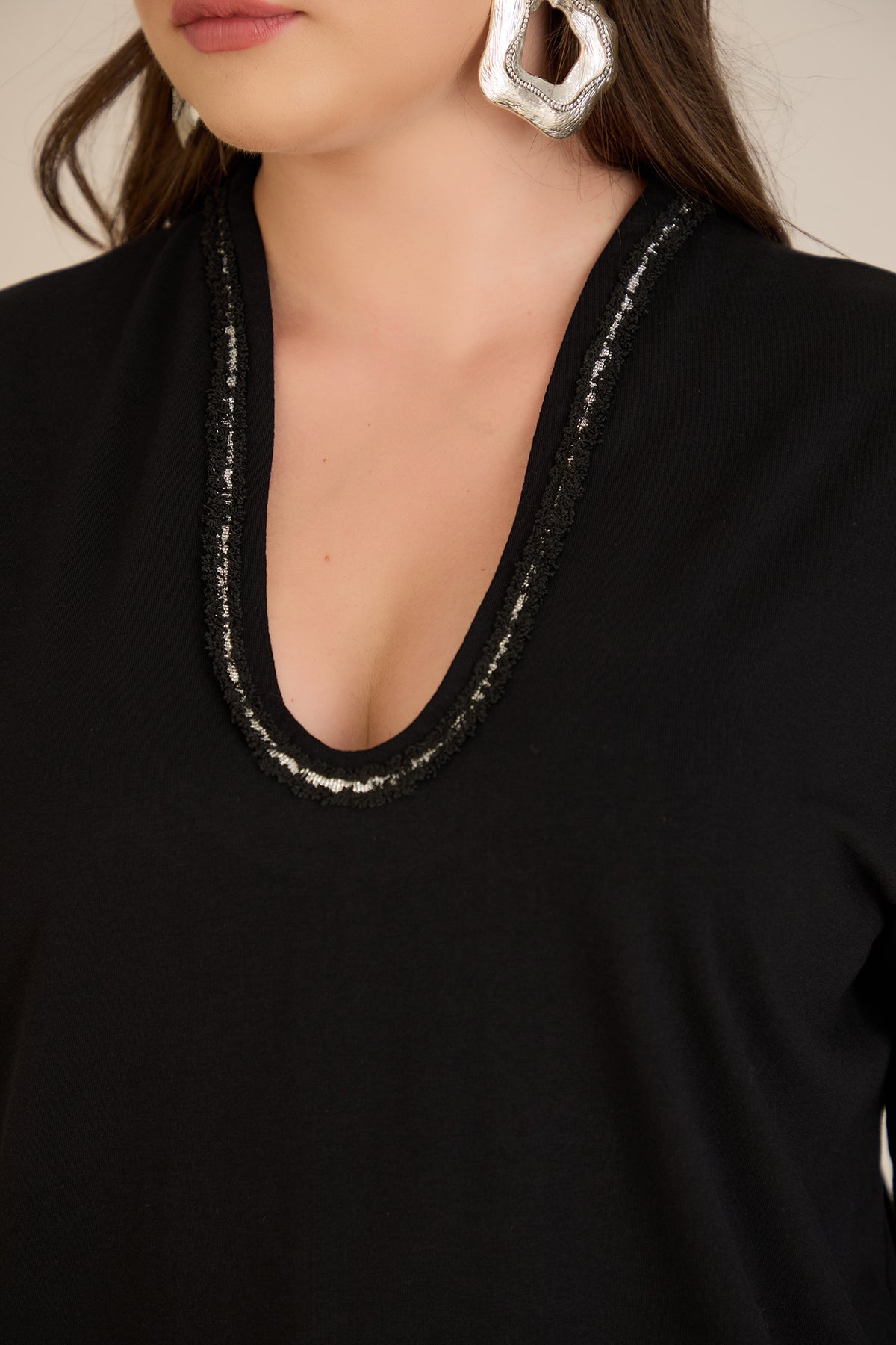 Памучна блуза с V-деколте със сребрист ширит - черен