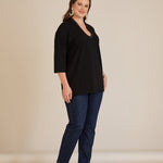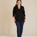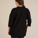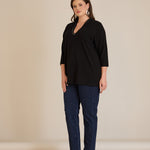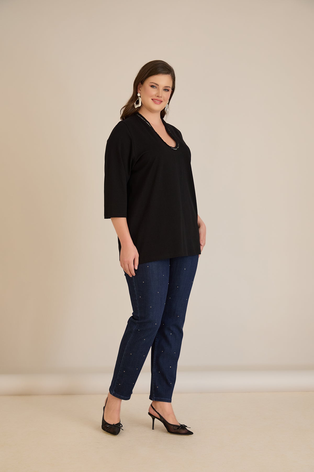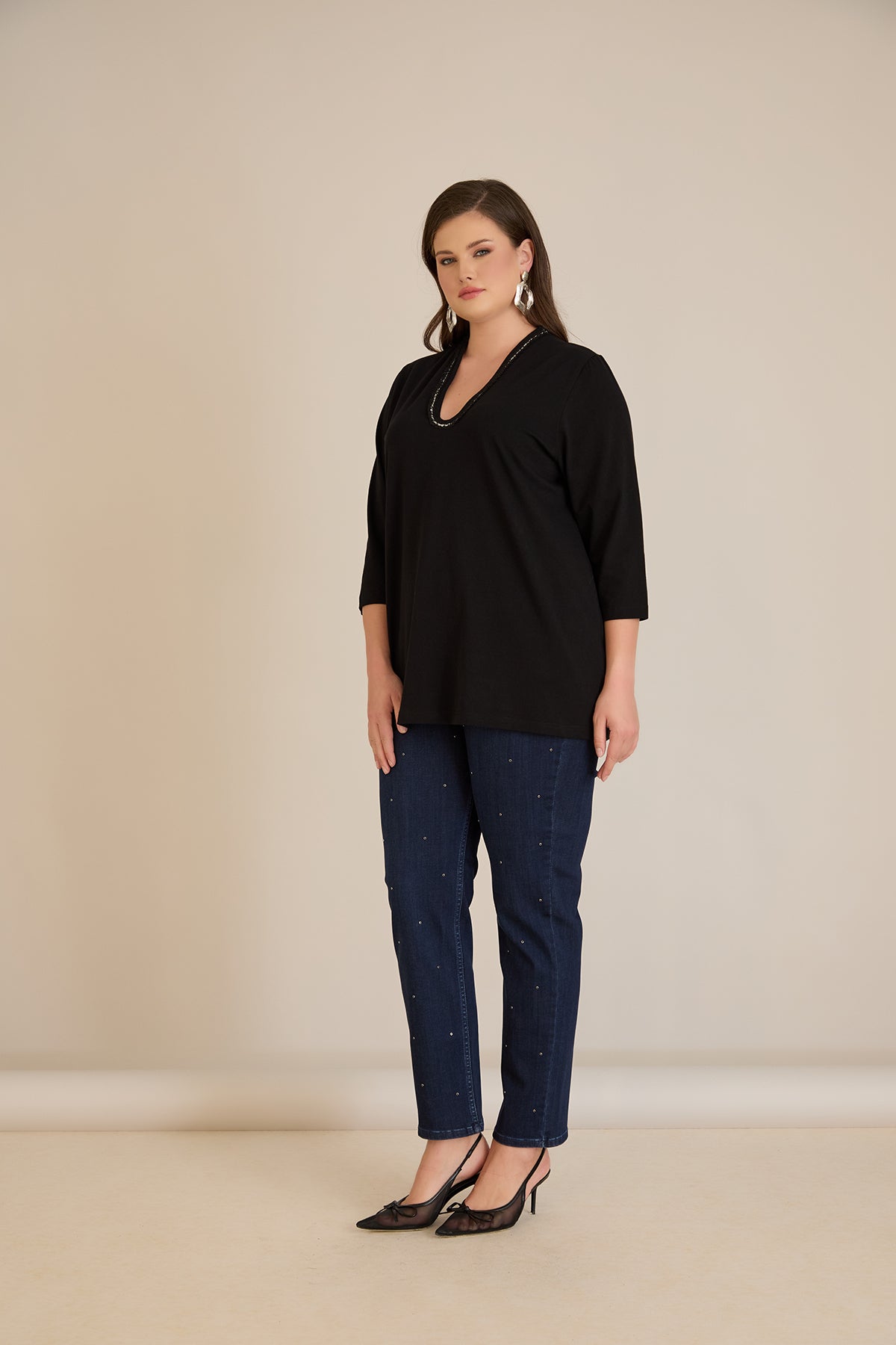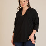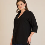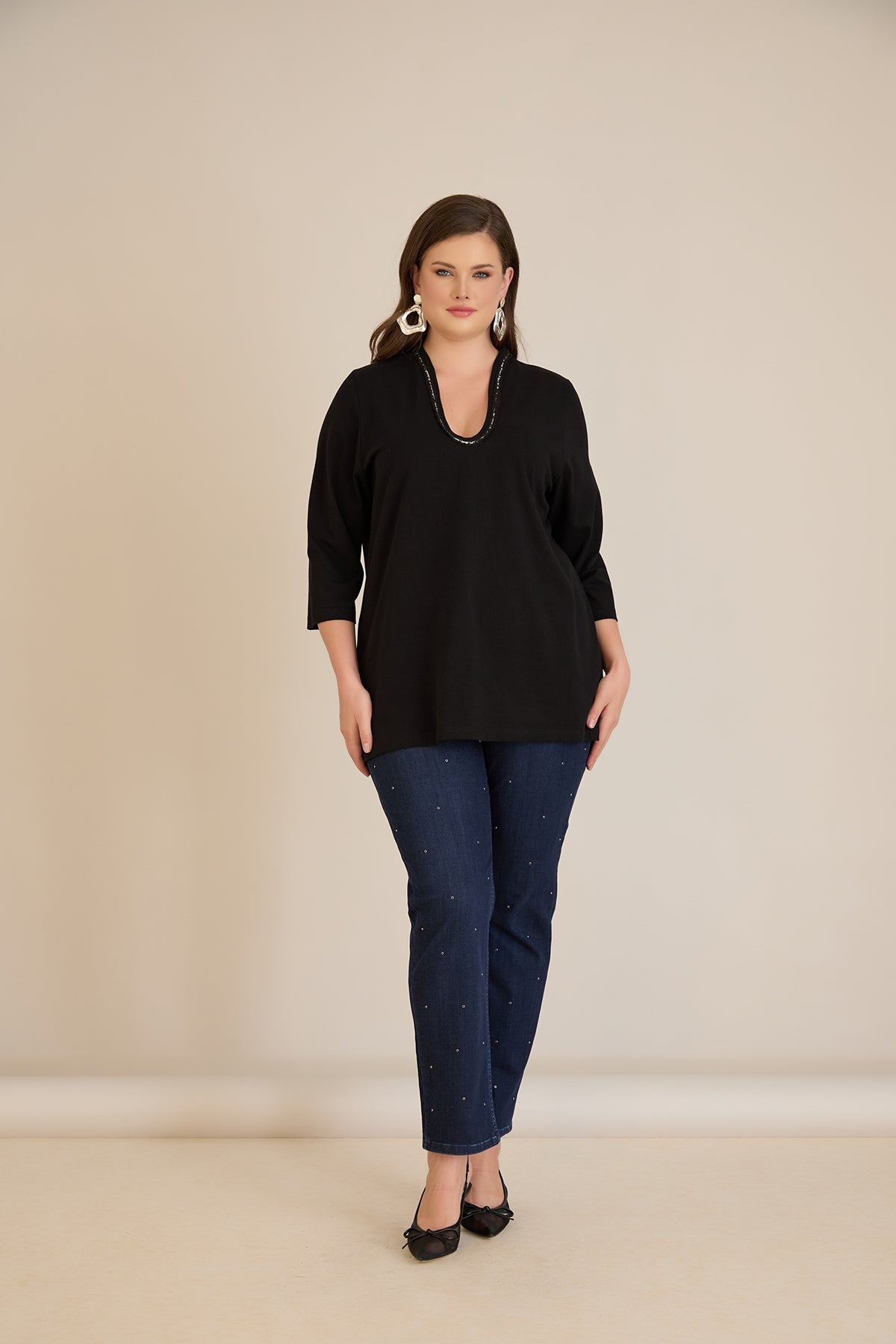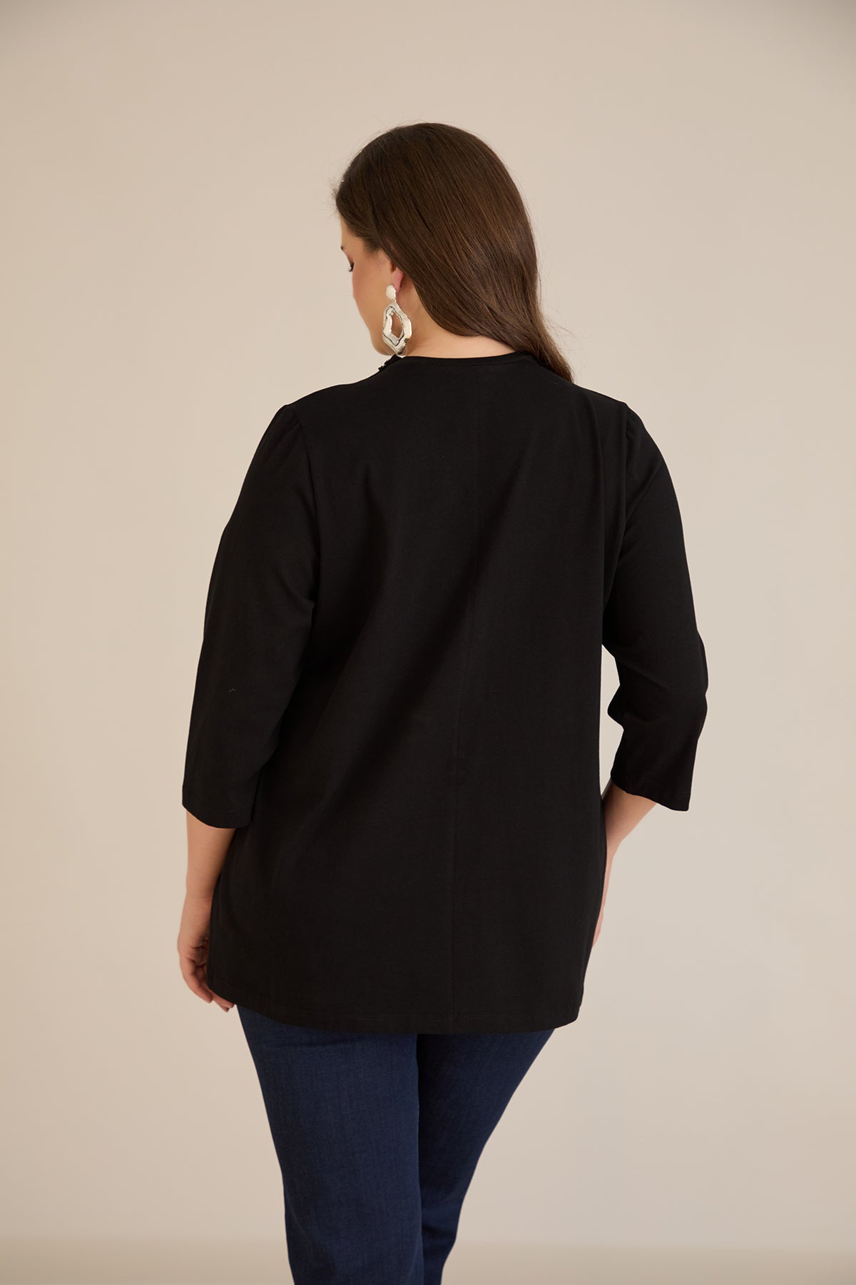 Памучна блуза с V-деколте със сребрист ширит - черен