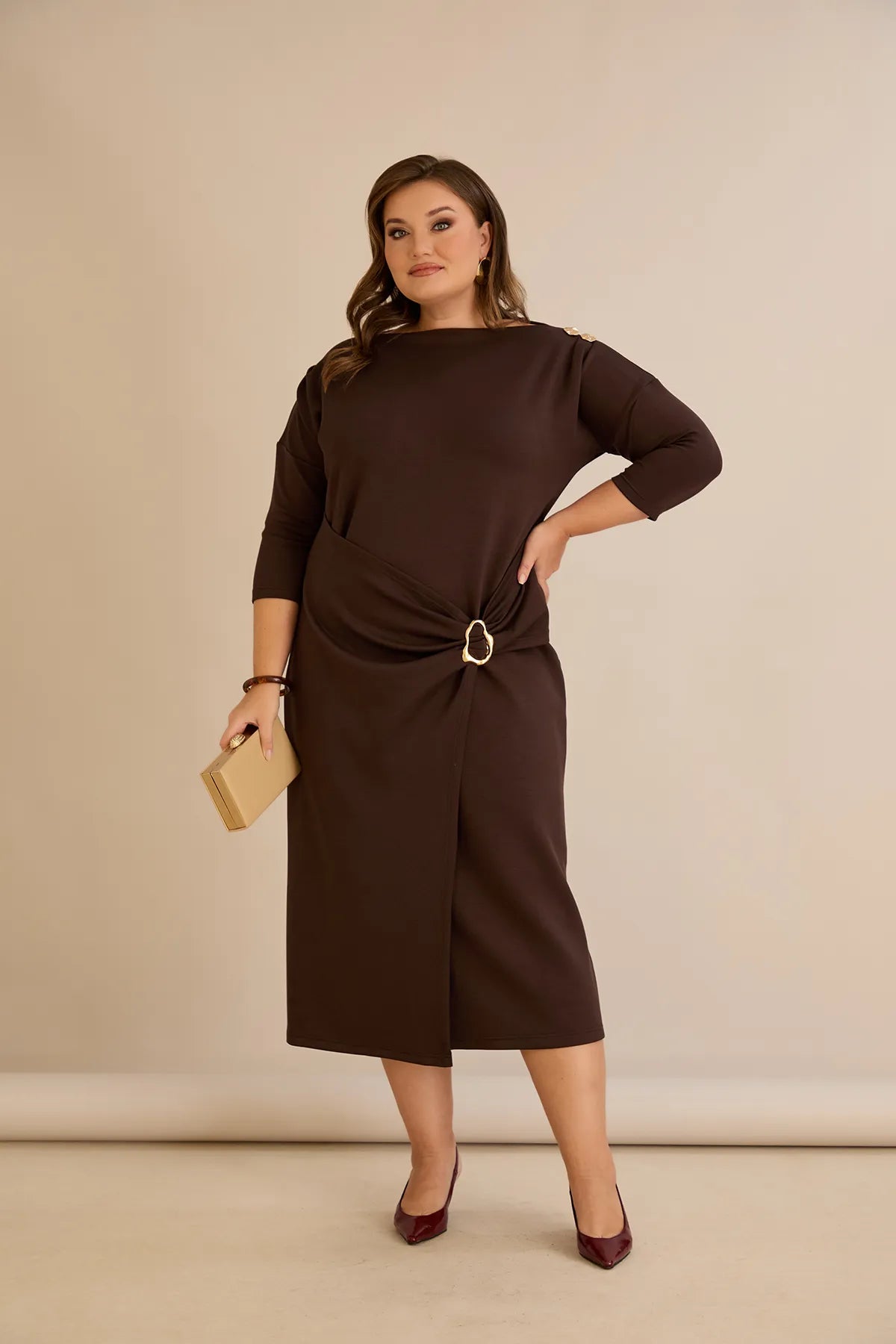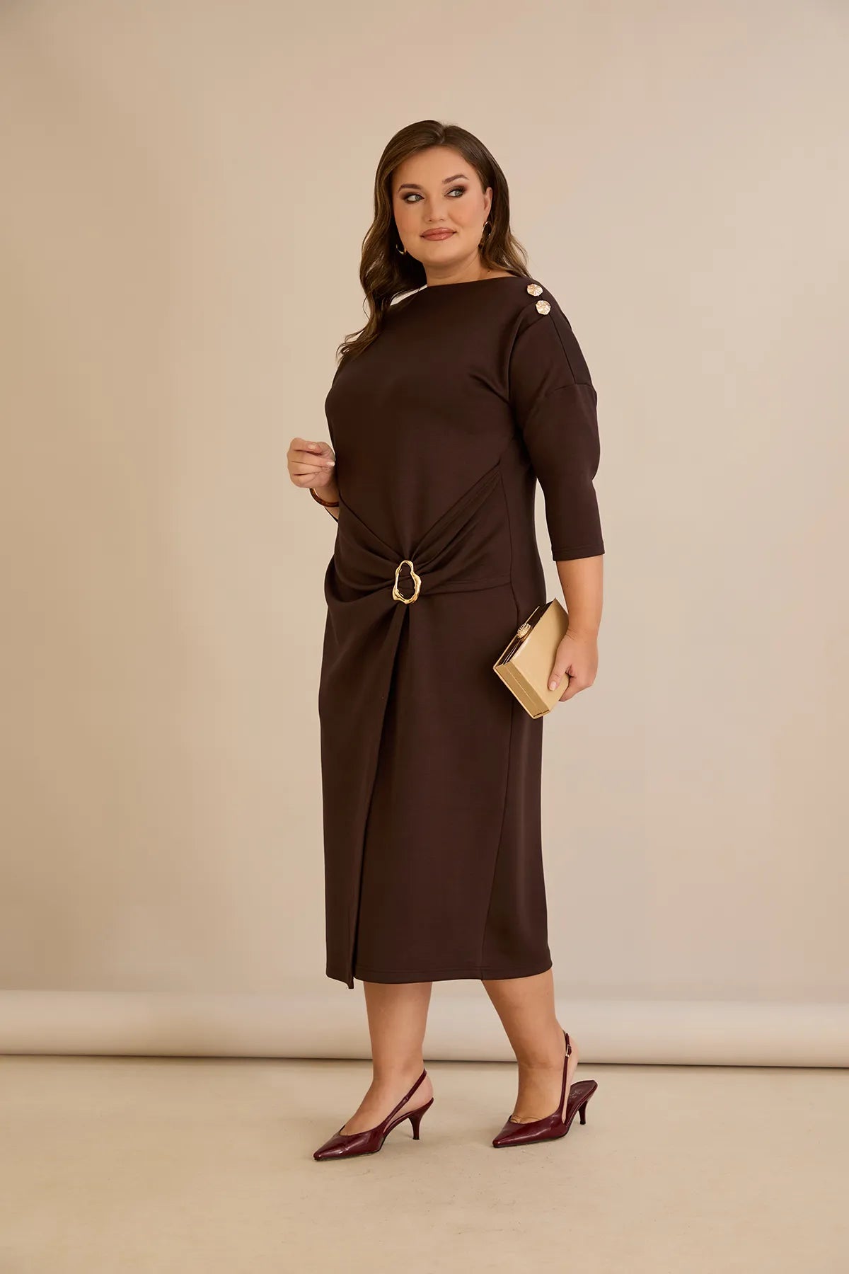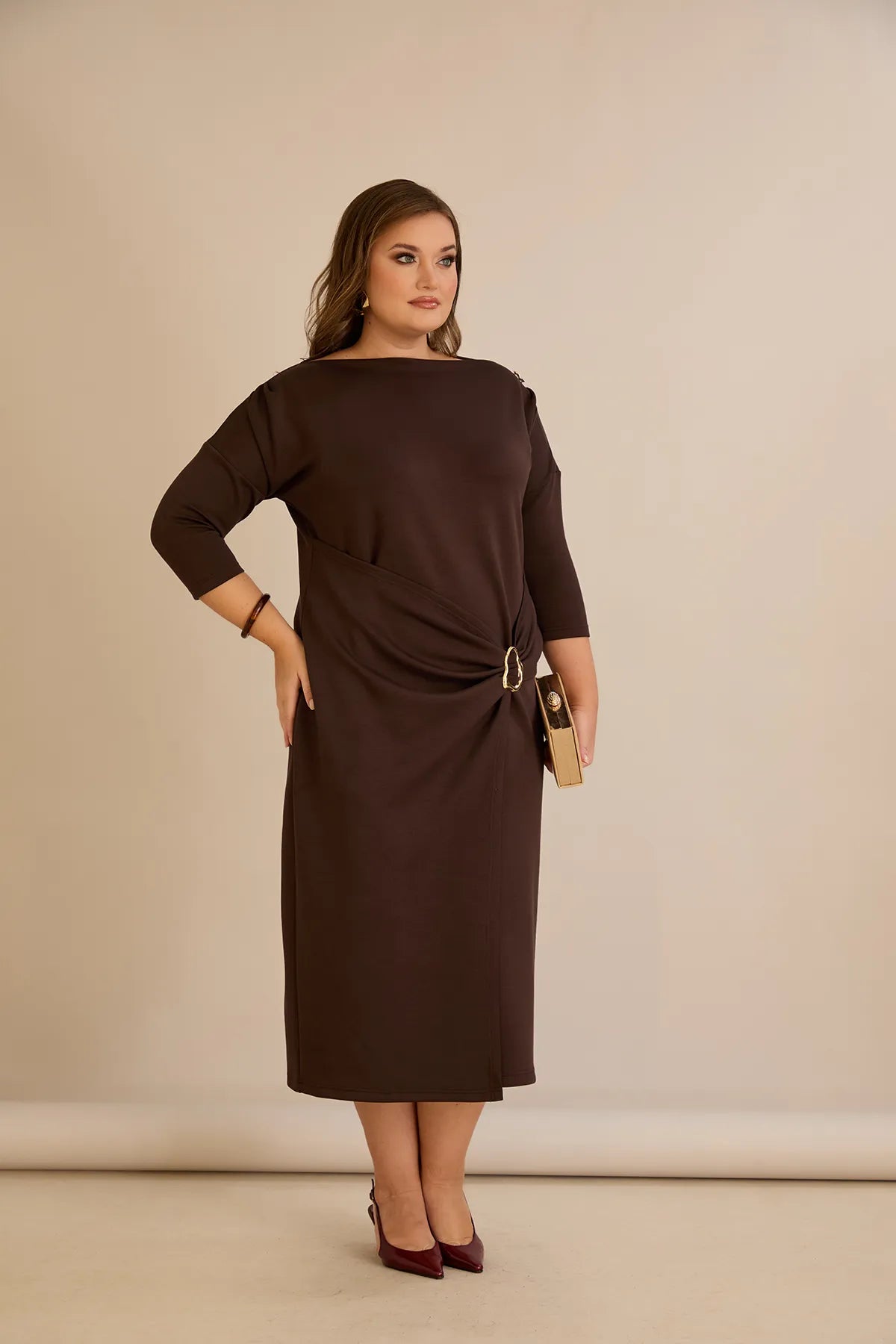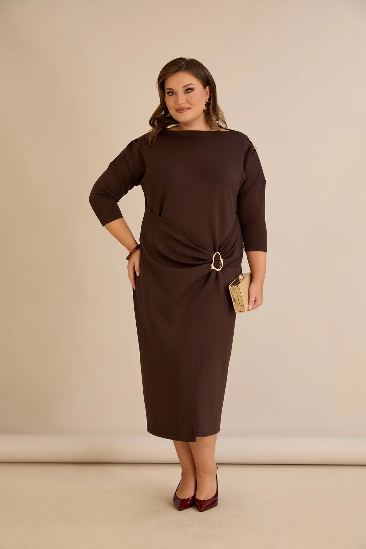 • Шикозно деколте тип -лодка- с акценти от брошки в златисто от едната страна на модела