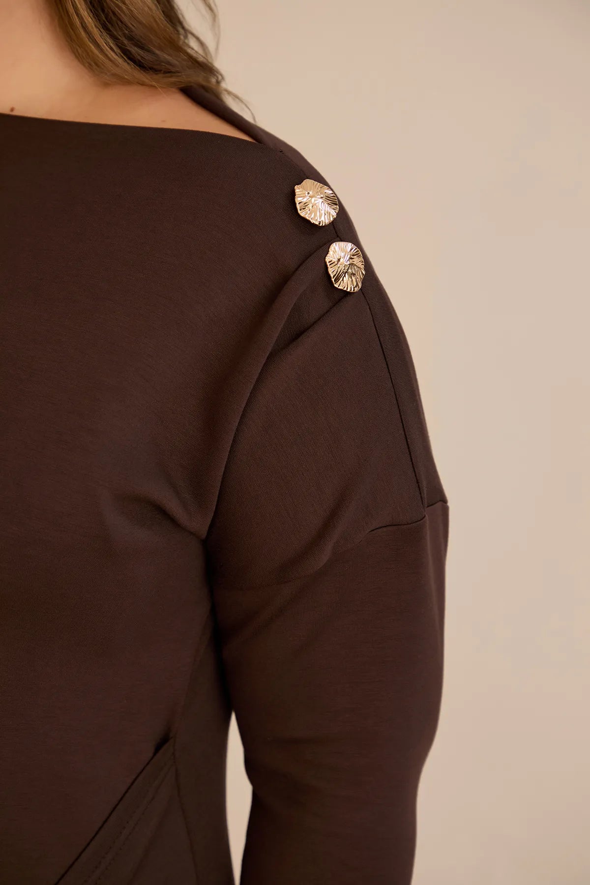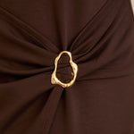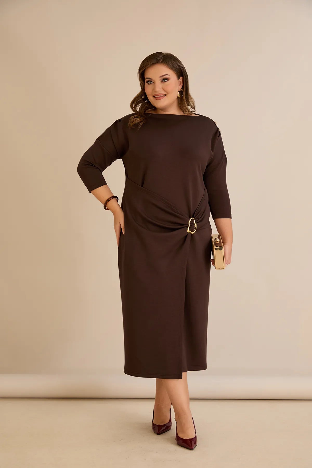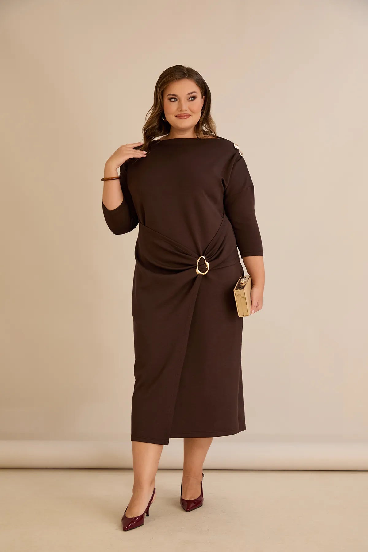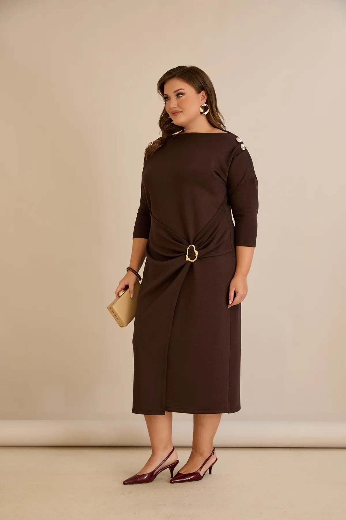 • Шикозно деколте тип -лодка- с акценти от брошки в златисто от едната страна на модела