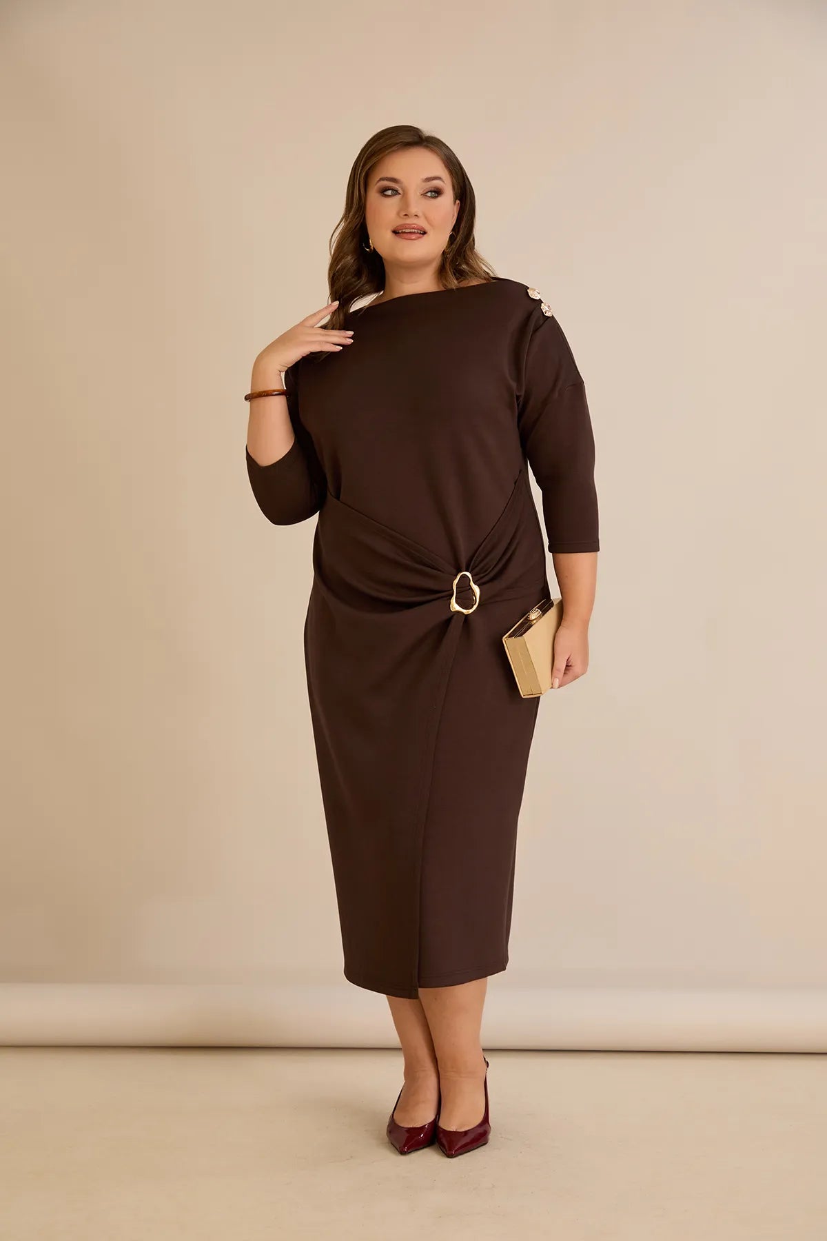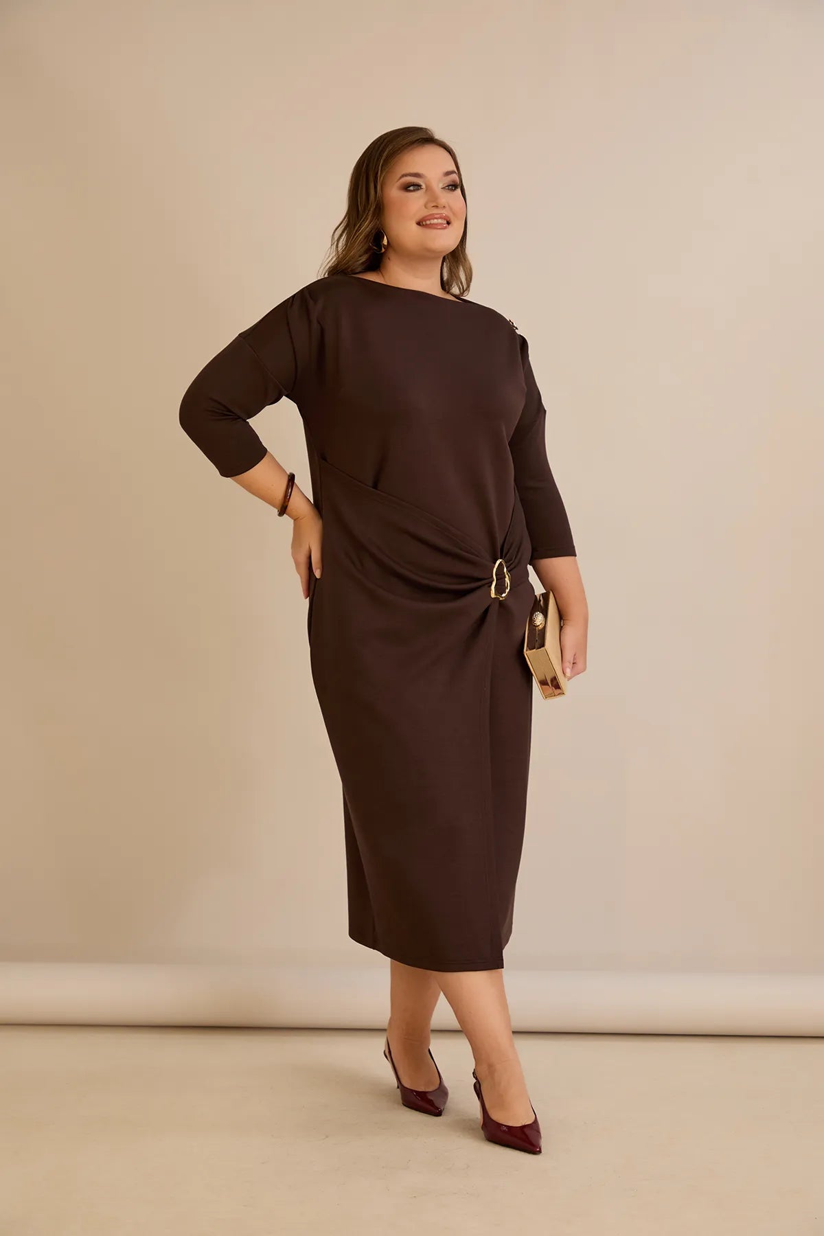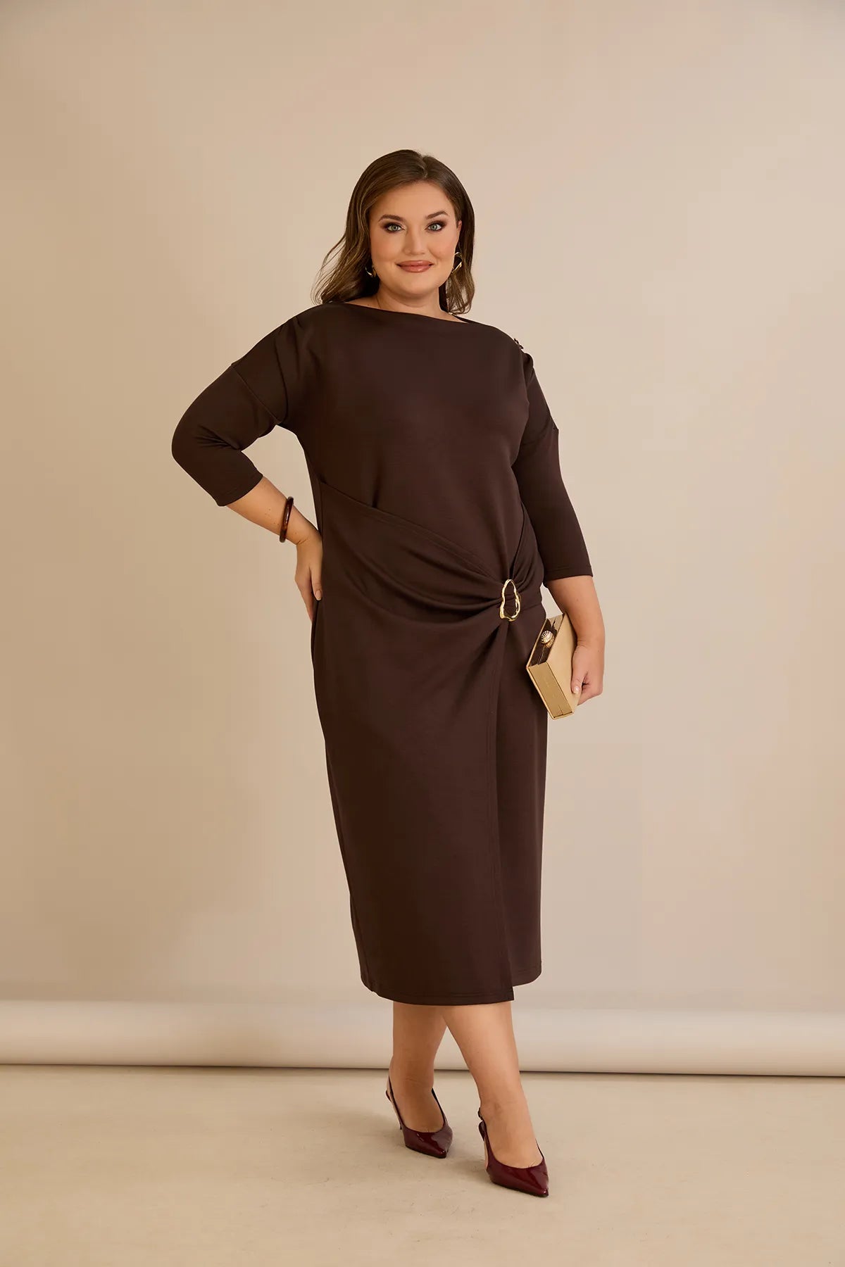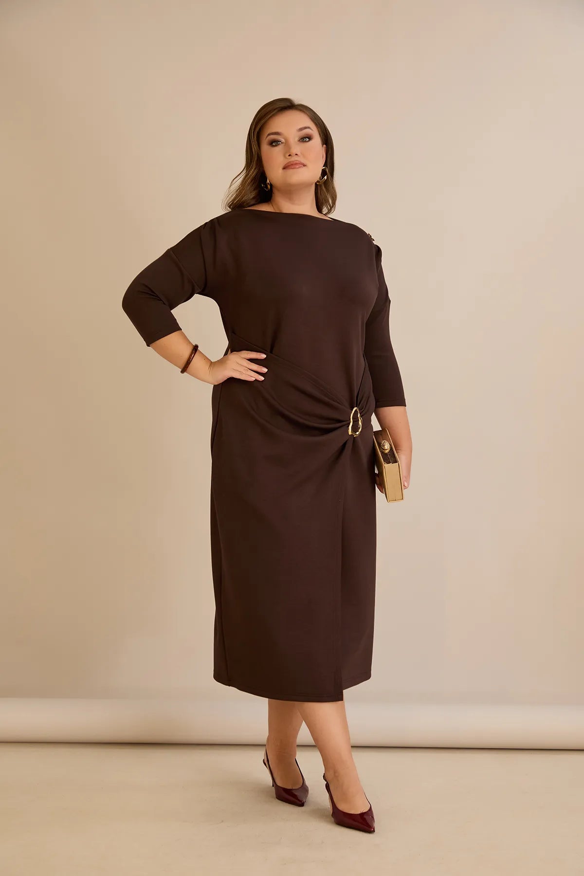 • Шикозно деколте тип -лодка- с акценти от брошки в златисто от едната страна на модела