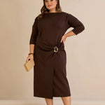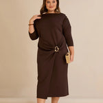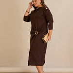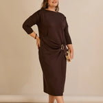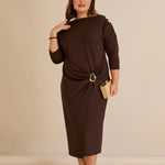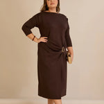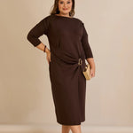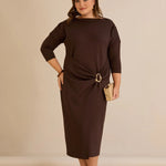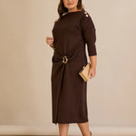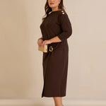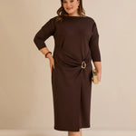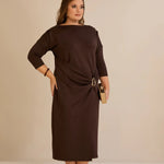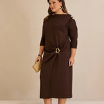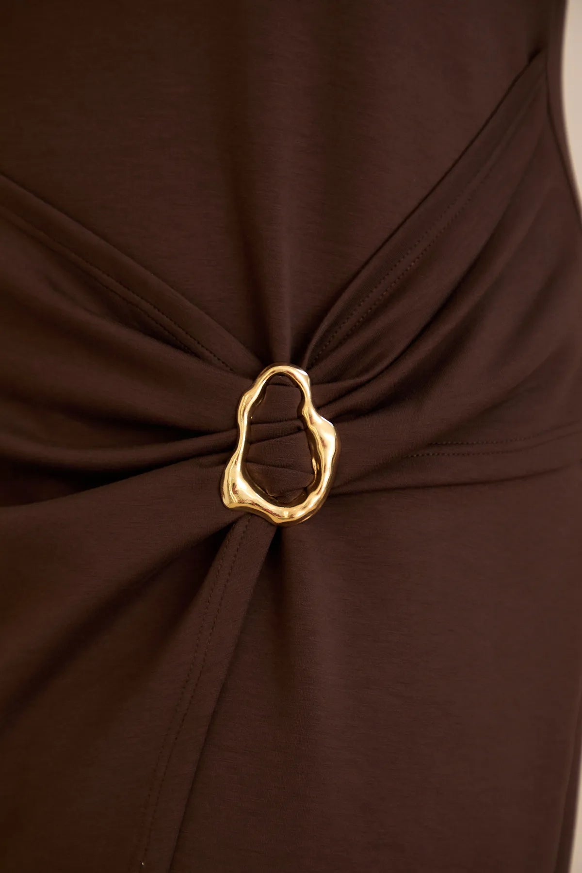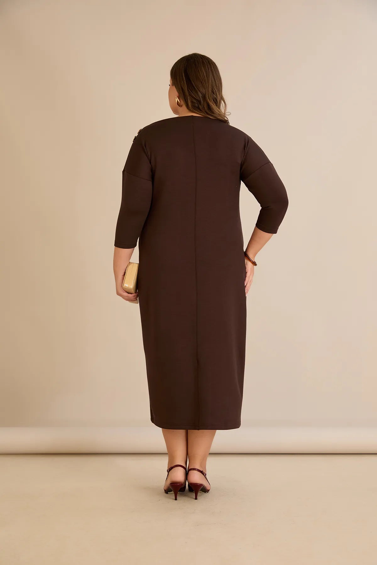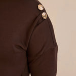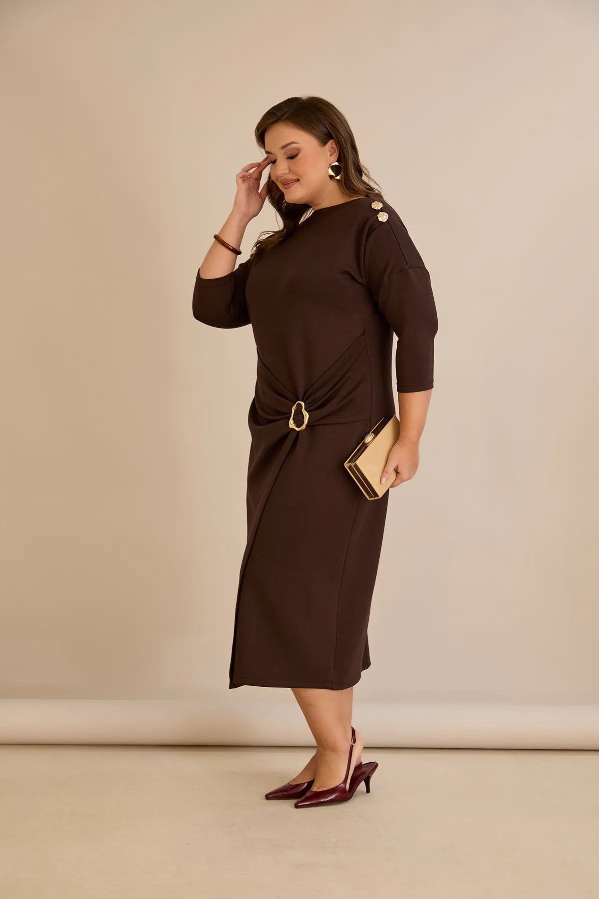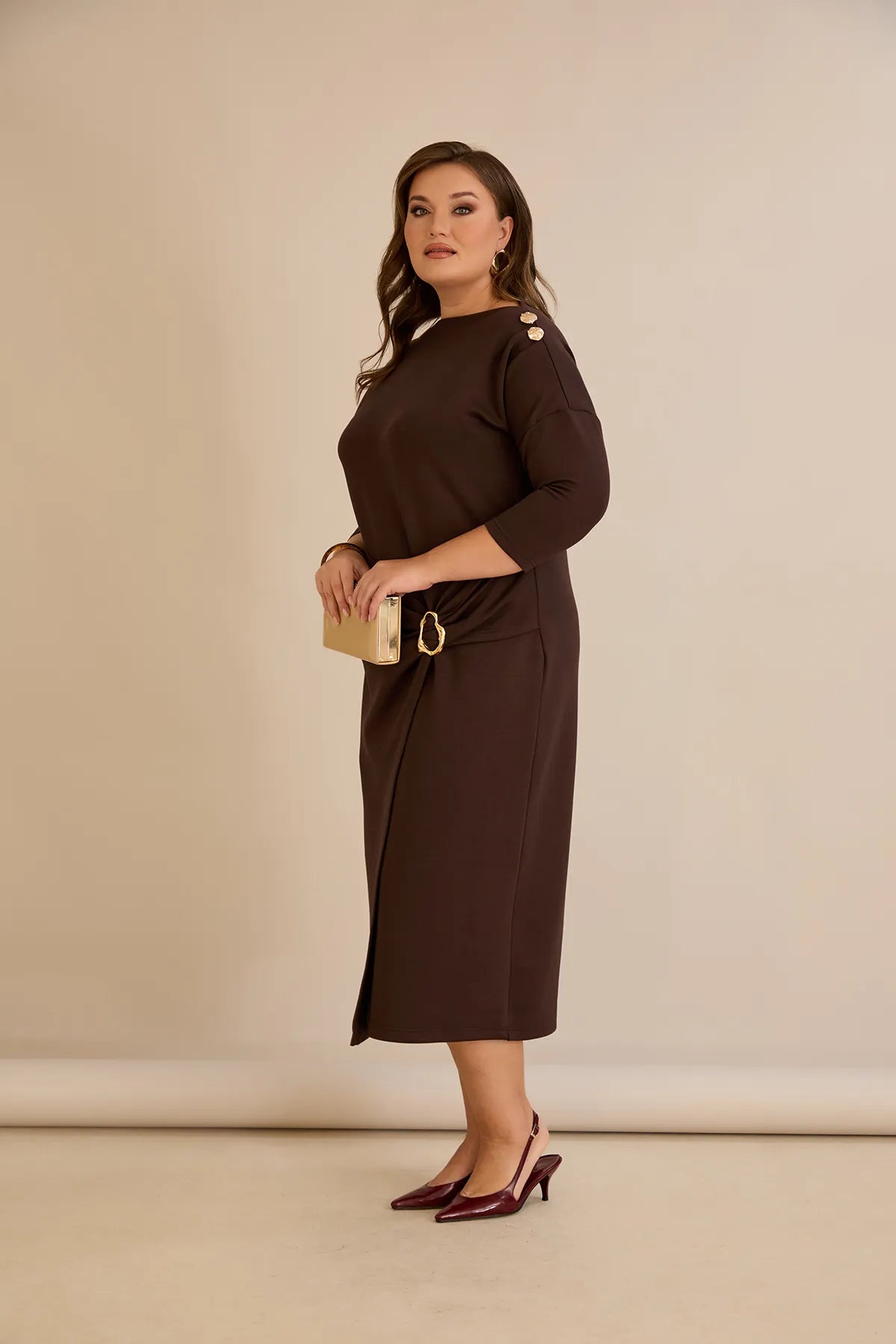 • Шикозно деколте тип -лодка- с акценти от брошки в златисто от едната страна на модела