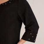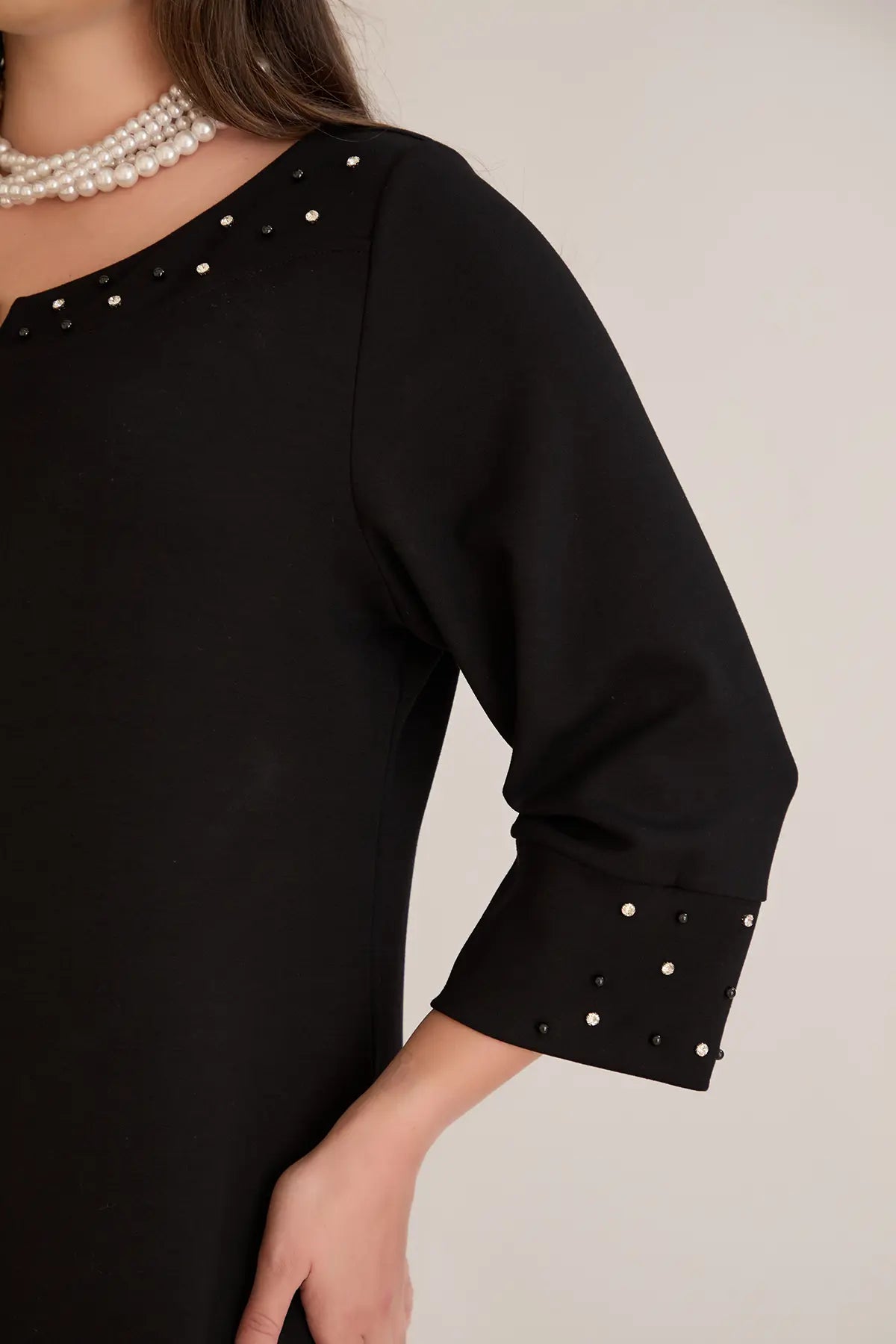 • Редуване на камъчета и перли на деколтето и маншета на ръкавите