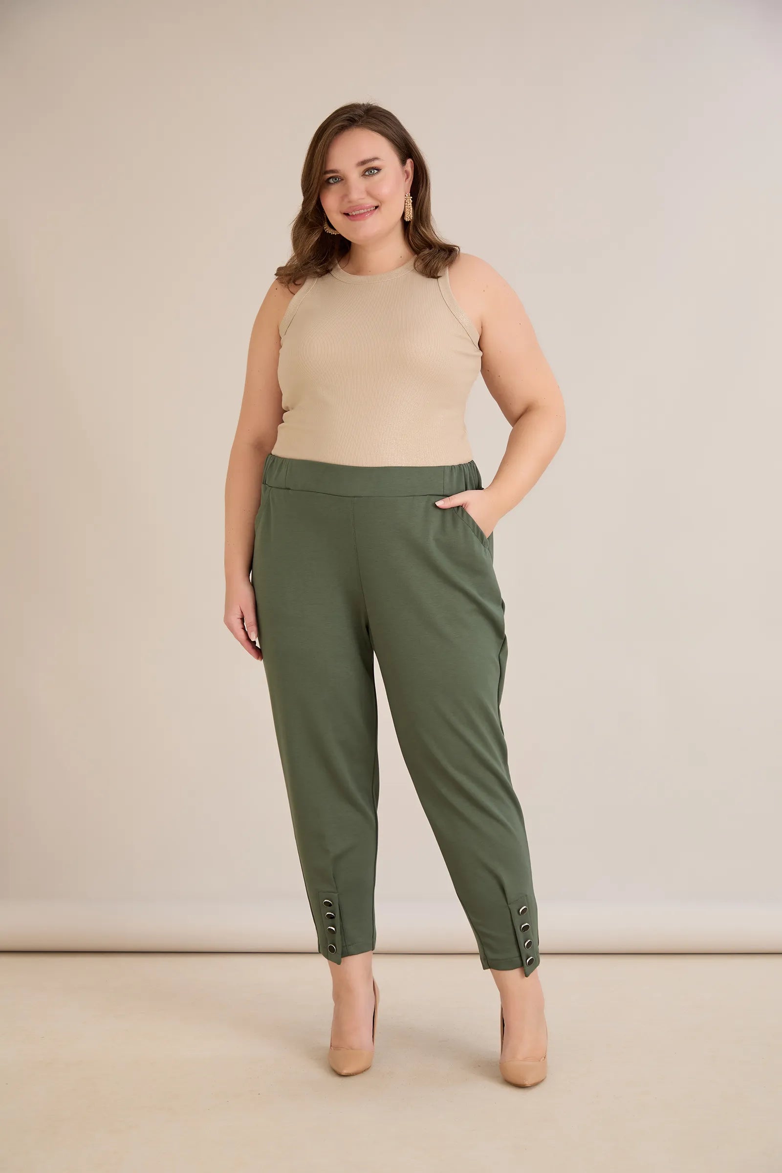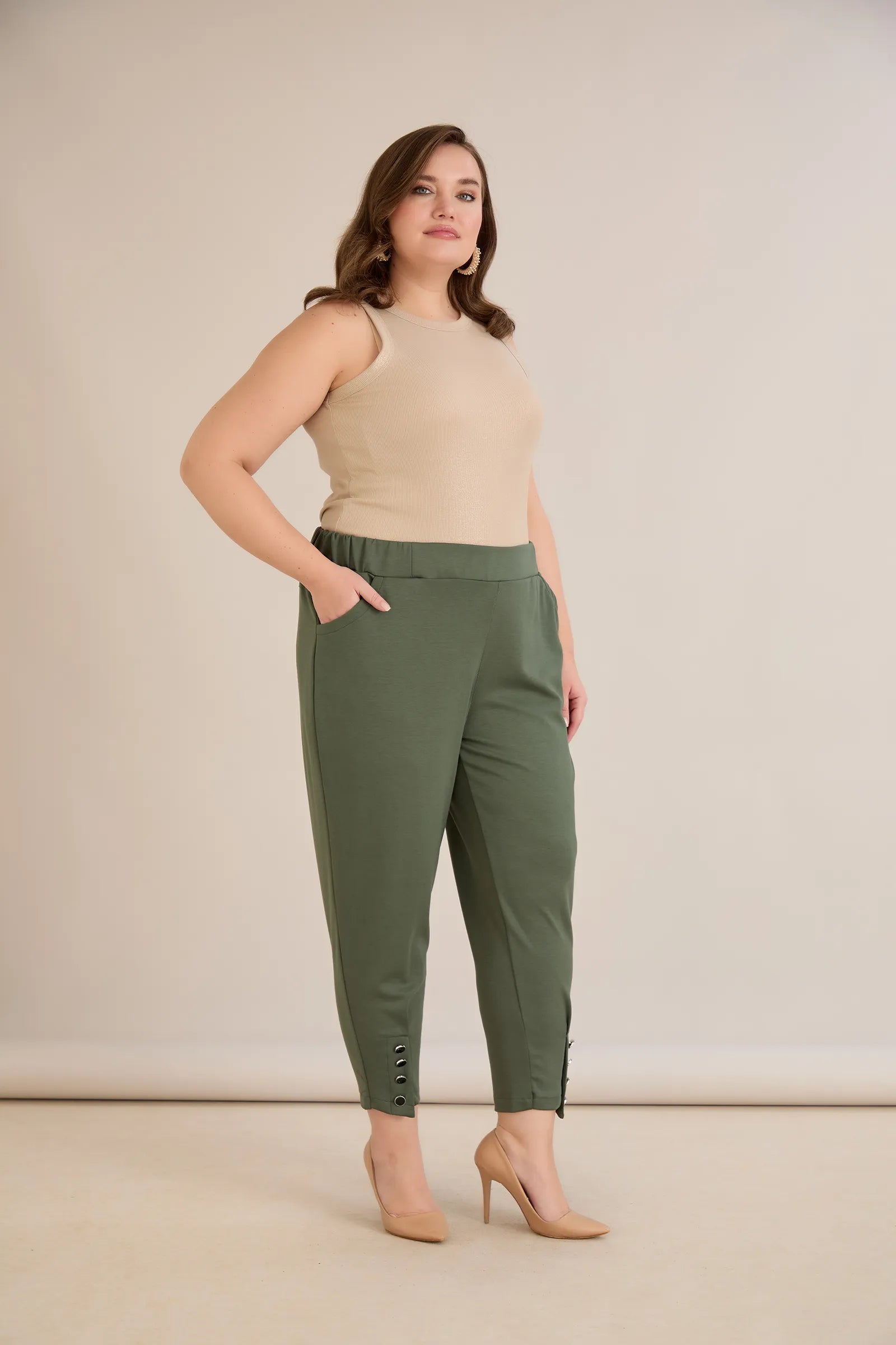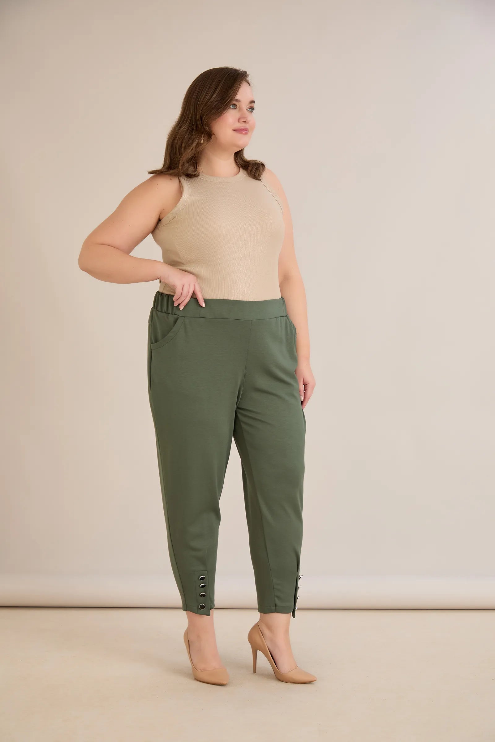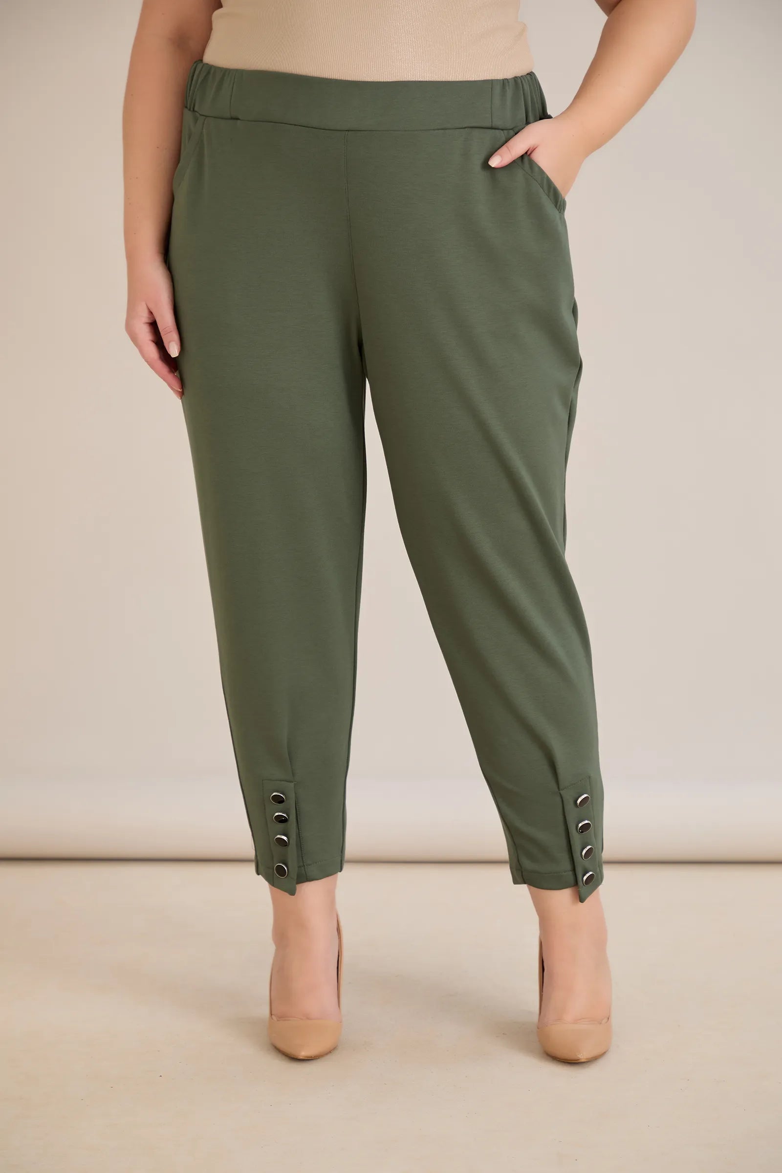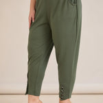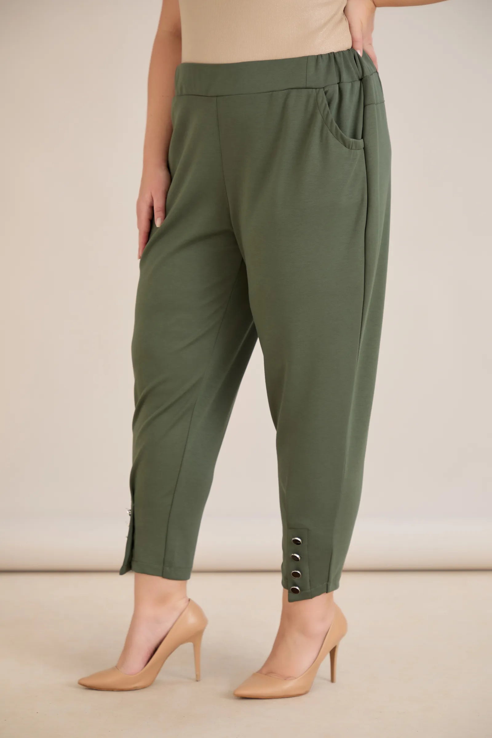 Еластичен дамски панталон с копчета - олив