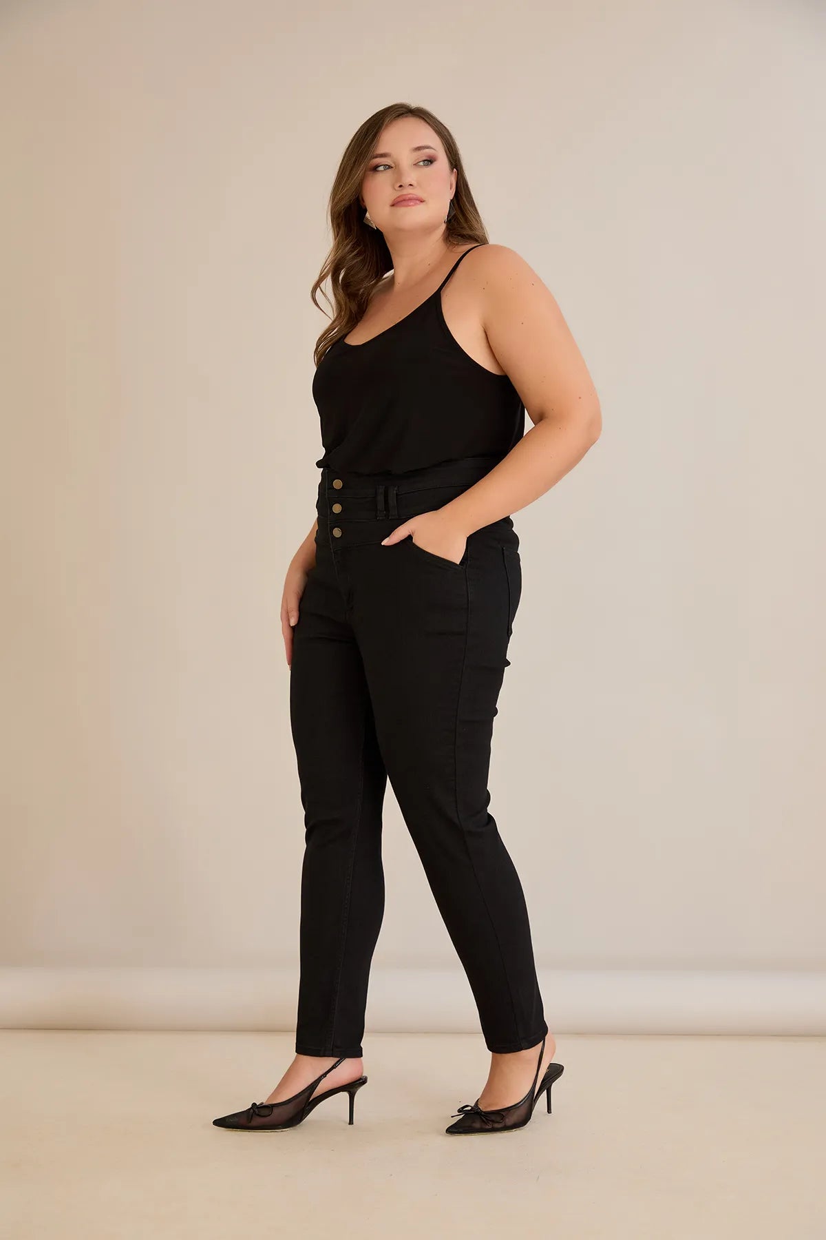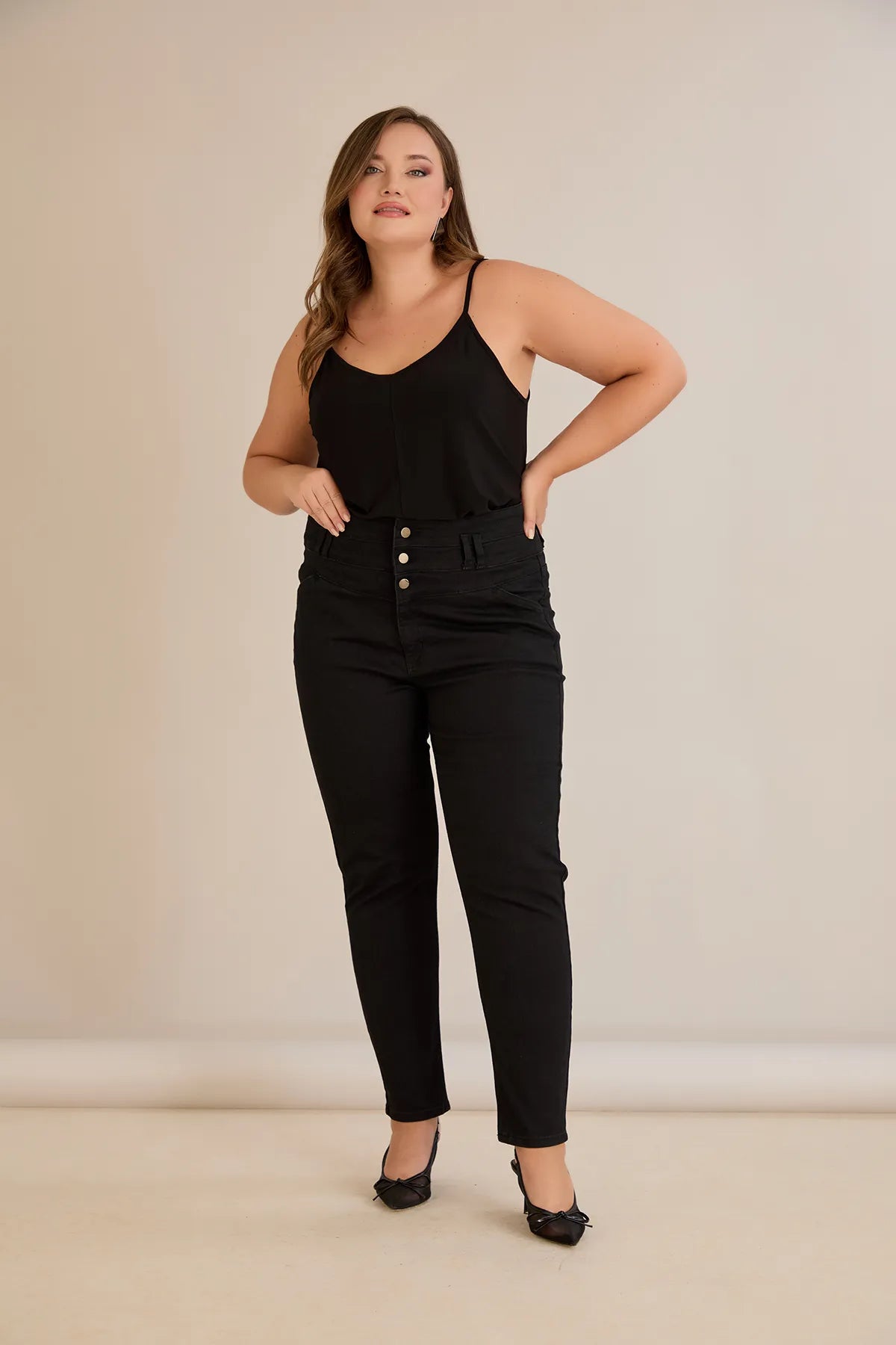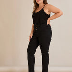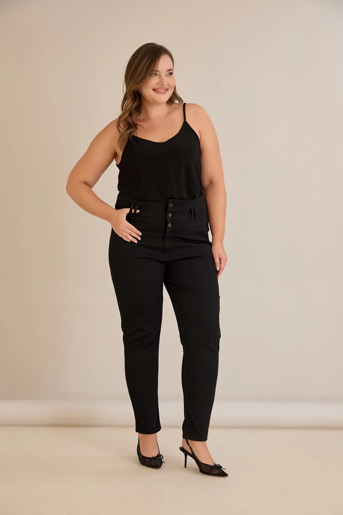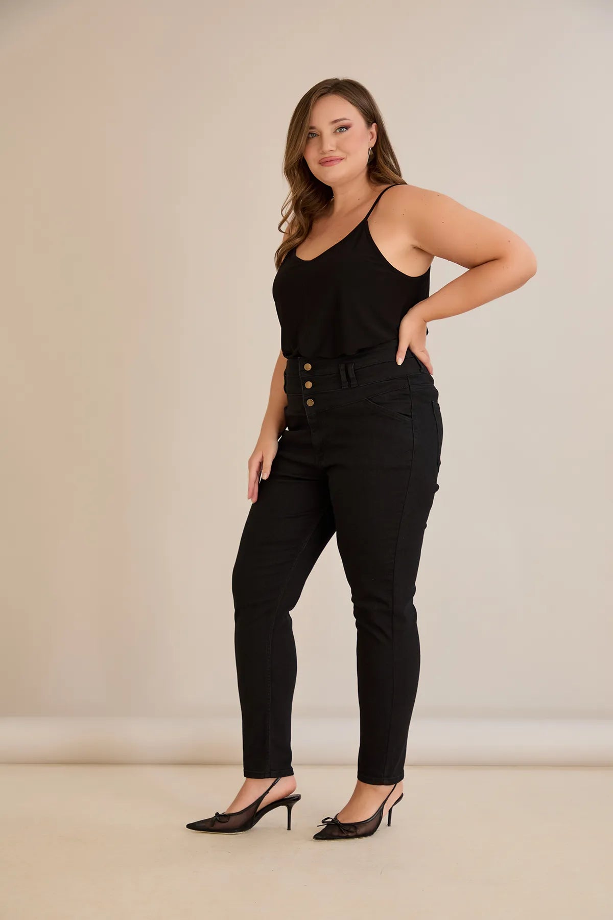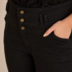 Еластични дънки с висока талия и копчета - черен