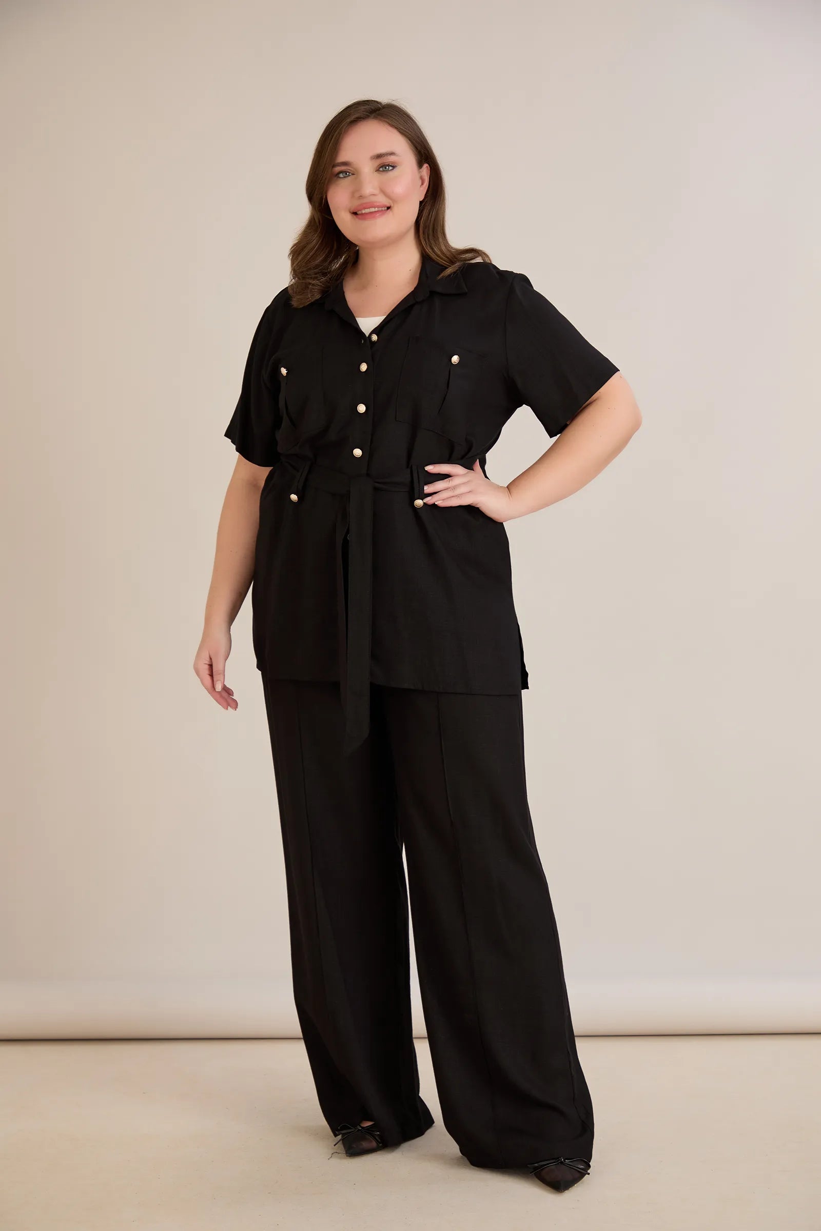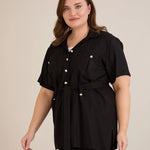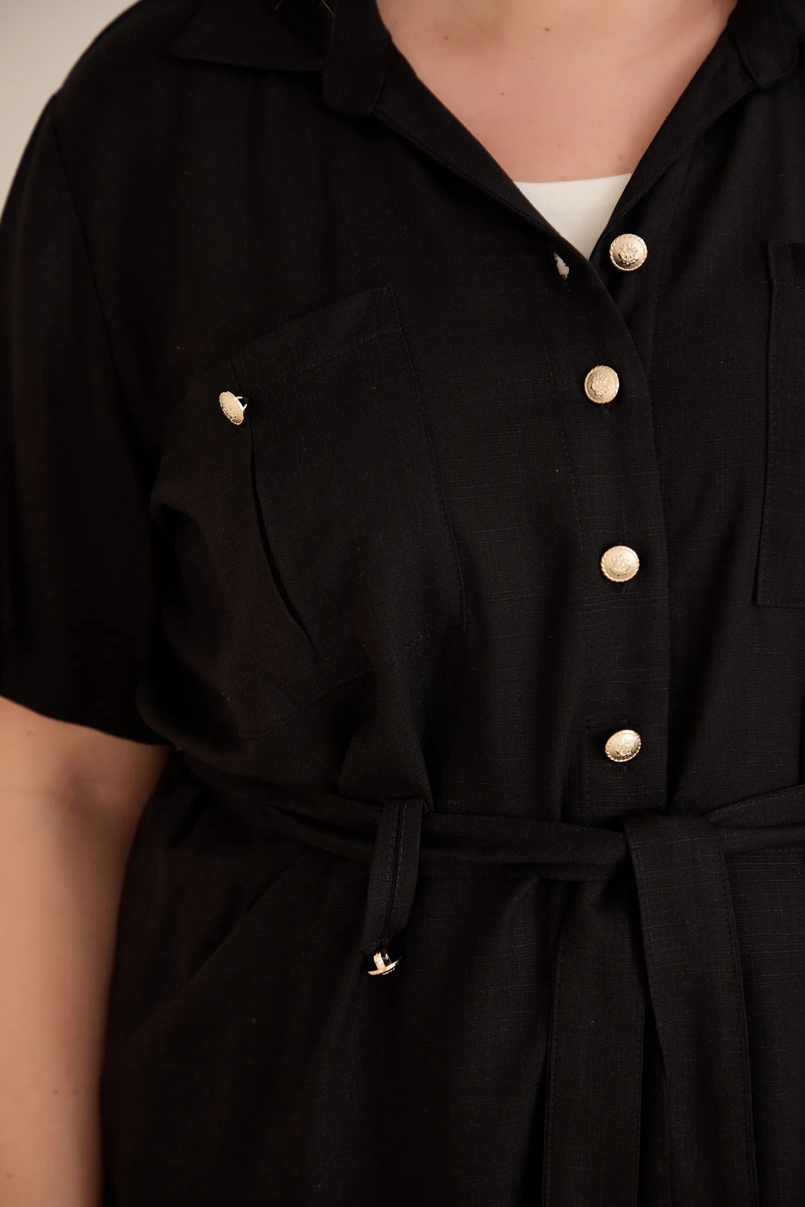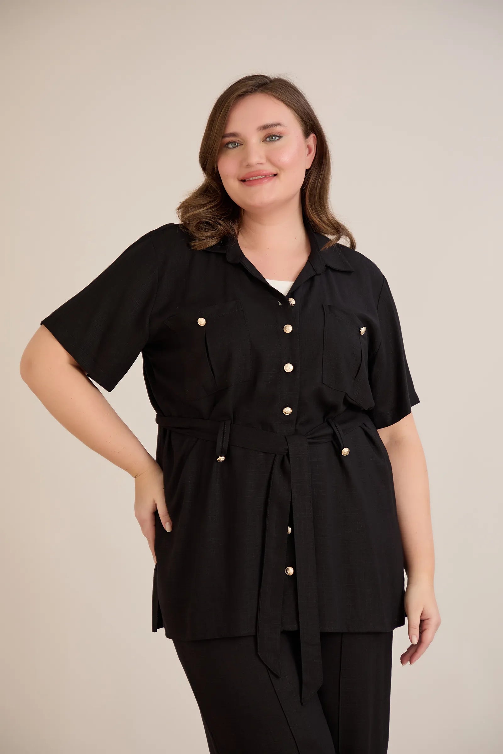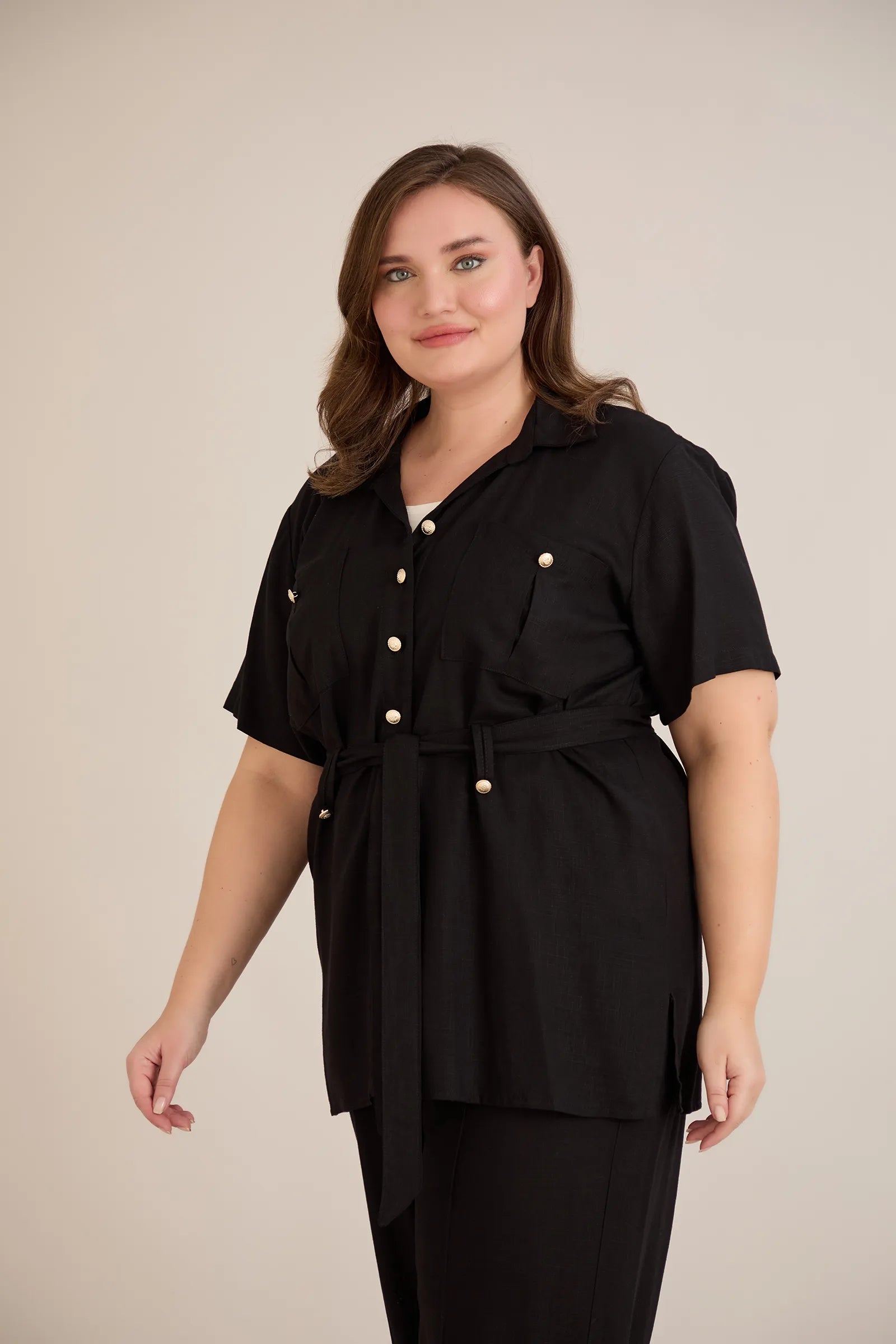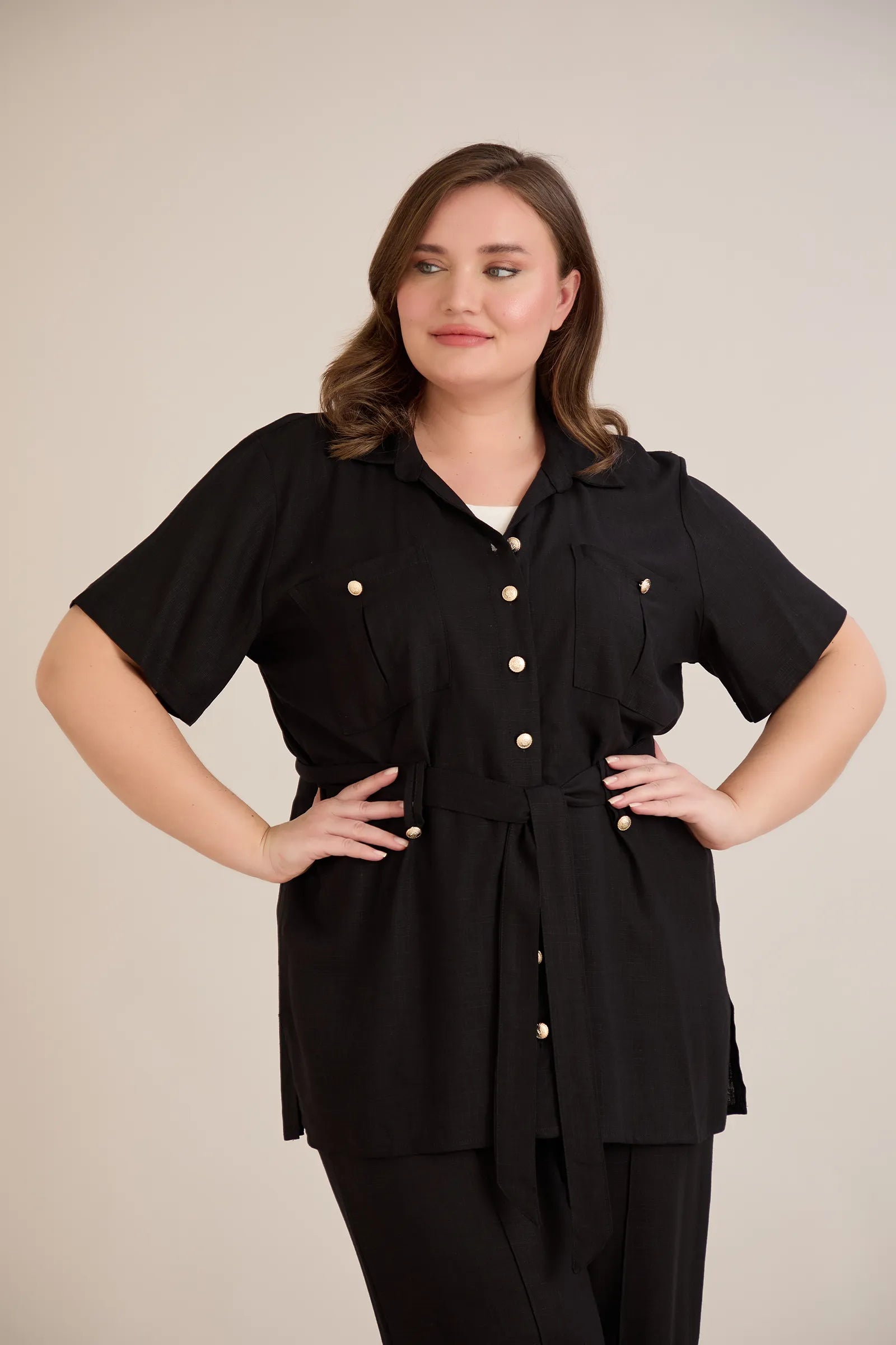• Риза с  колан с илици и джобове и закопчаване с копчета в златисто