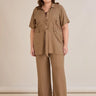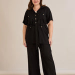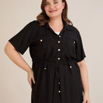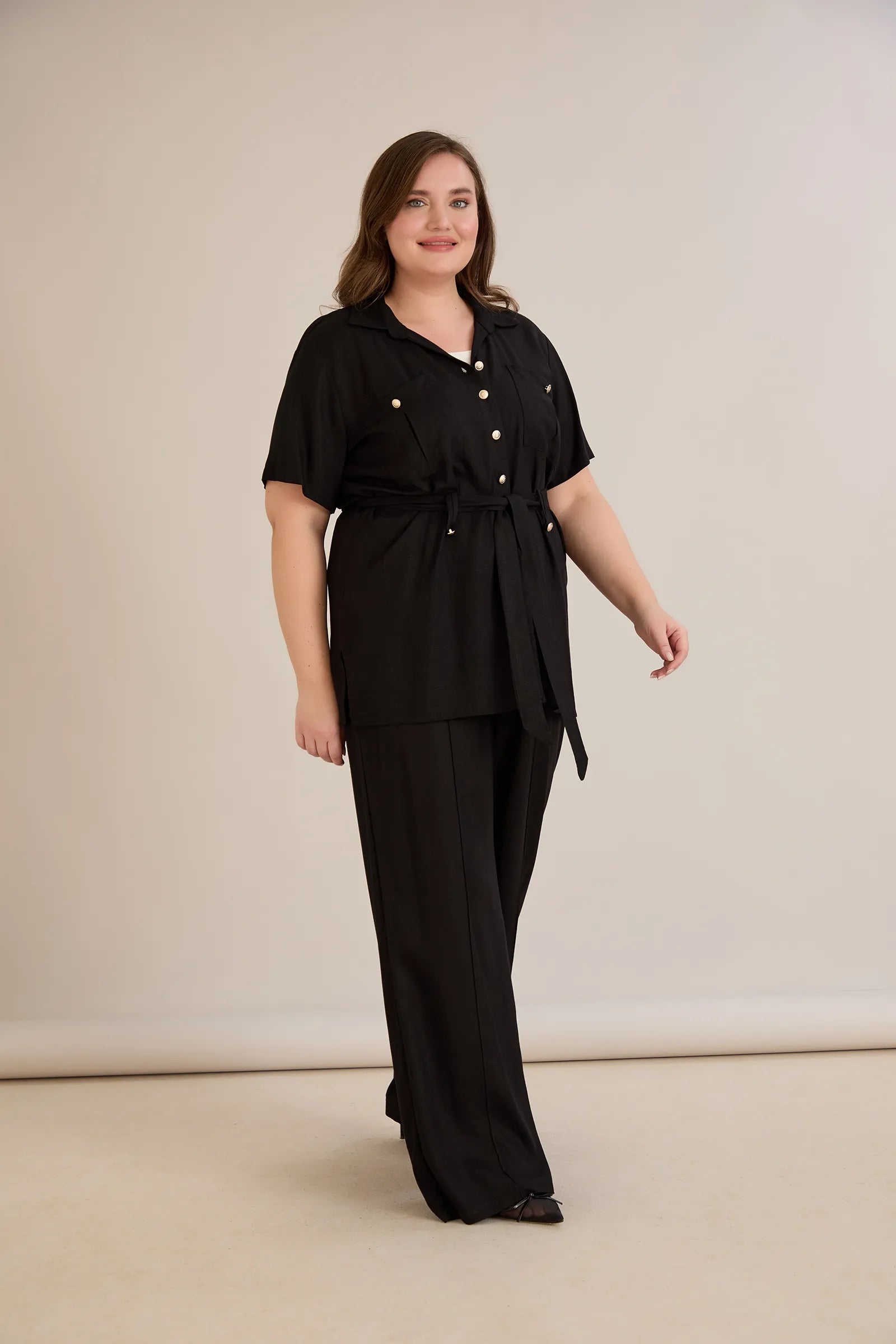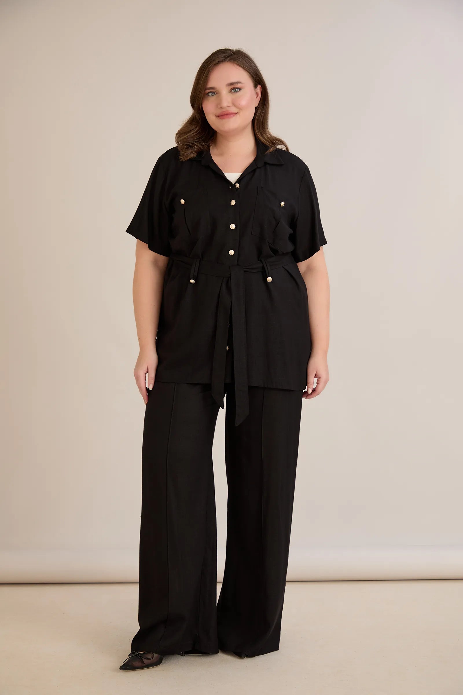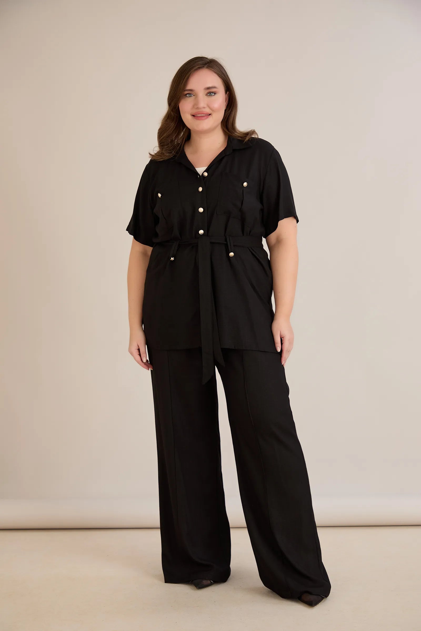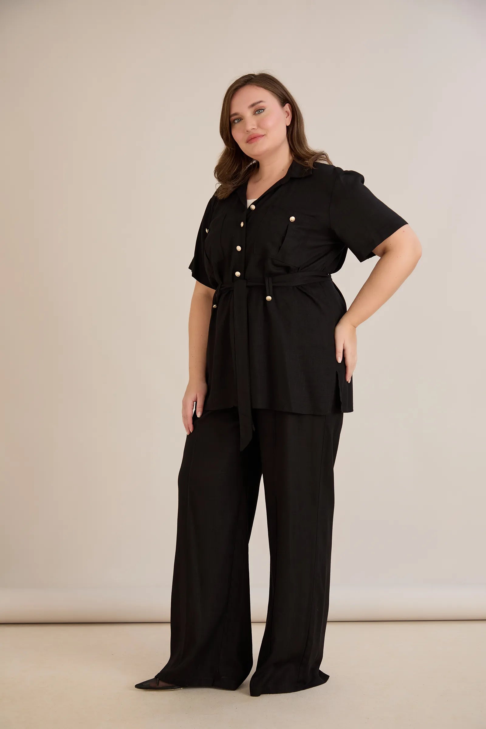 • Риза с  колан с илици и джобове и закопчаване с копчета в златисто